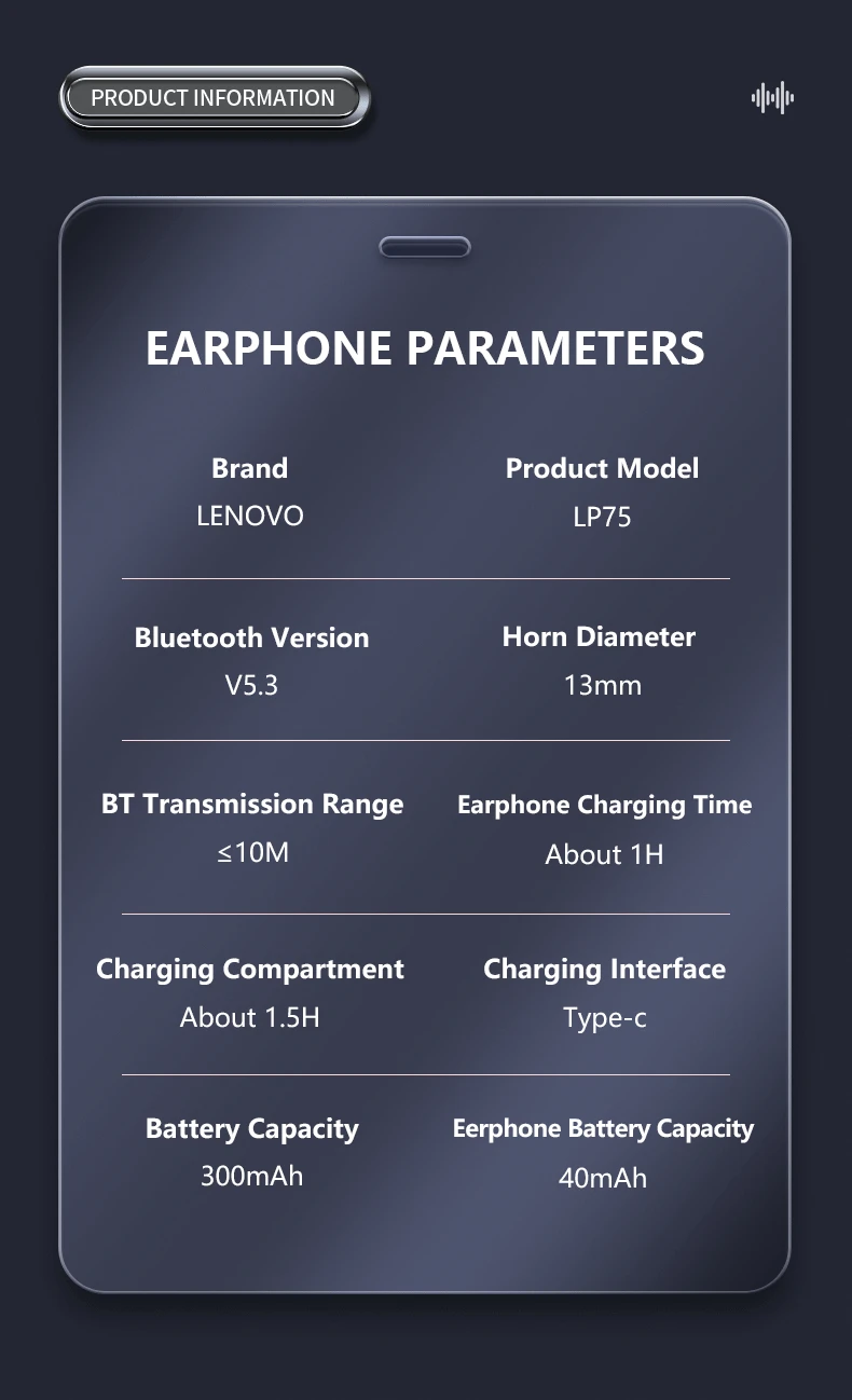 Lenovo Original LP75 TWS 5.3 Auriculares inalámbricos Bluetooth Auriculares LED con reducción de ruido