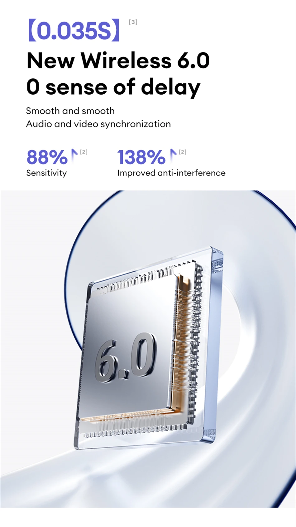El chip Bluetooth 6.0 mejorado ofrece un retraso casi nulo (0,035 s), un emparejamiento estable y una mejor resistencia a las interferencias.