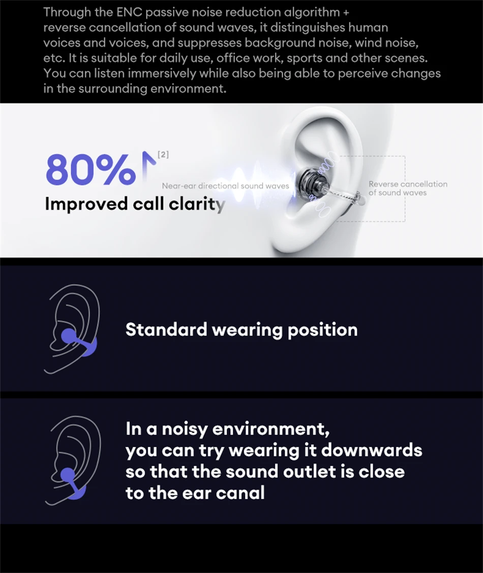 El algoritmo ENC avanzado filtra el viento y el ruido de fondo, mejorando la claridad vocal en el uso diario, laboral o deportivo.