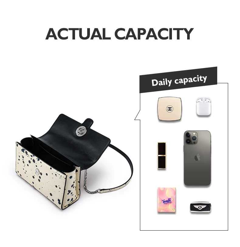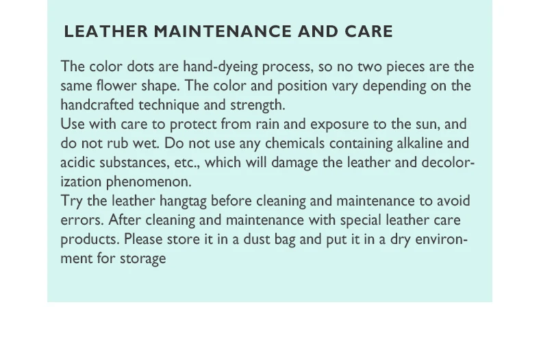 This bag is made of high-quality cowhide, the cowhide coating used is light and thin, the leather surface is entirely different from the artificial leather artificial processing properties, fully retains the original characteristics of leather, it doesn't defect, you can choose not to buy it if you mind the natural marks; at the same time, the natural cowhide's features make the leather have highly valued. Natural cowhide has better breathability, tactile toughness, and plasticity; they are used in environmental craft; the products from this craft process are durable and have a specific collection value.