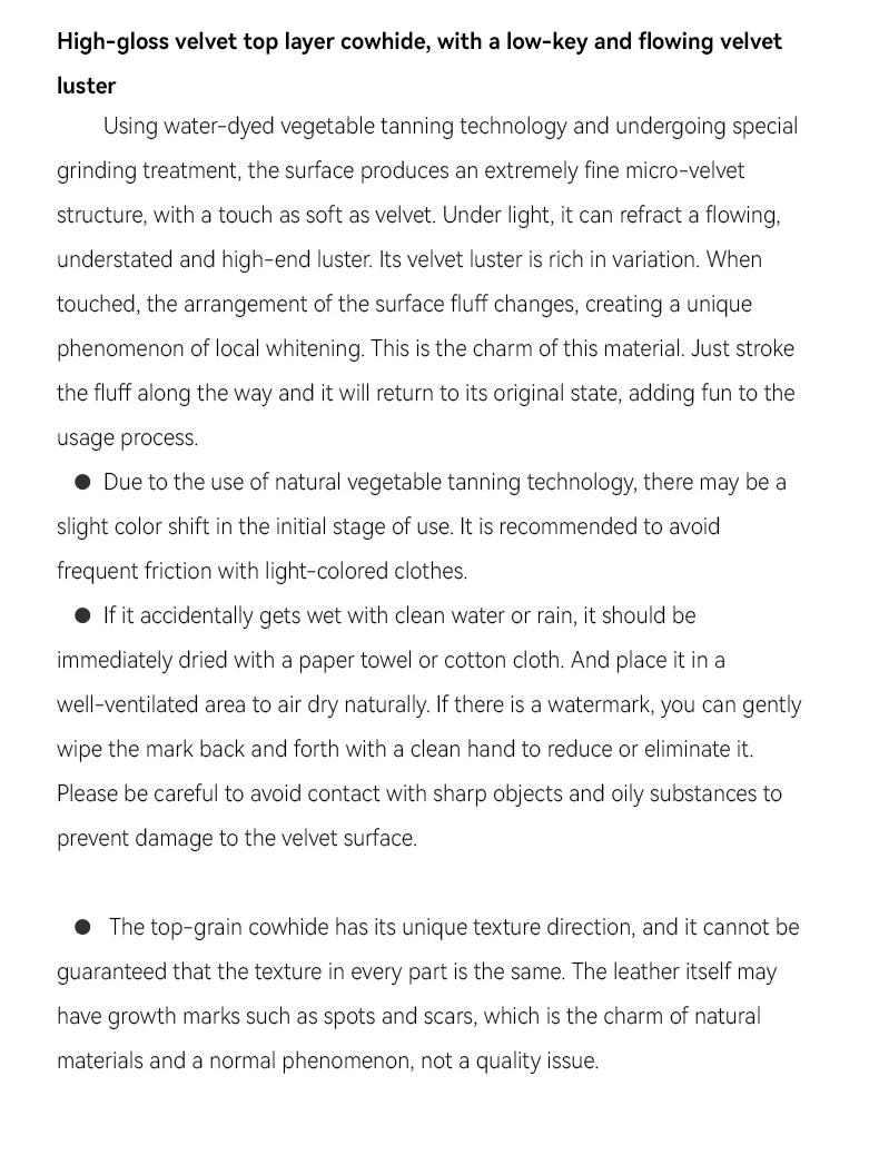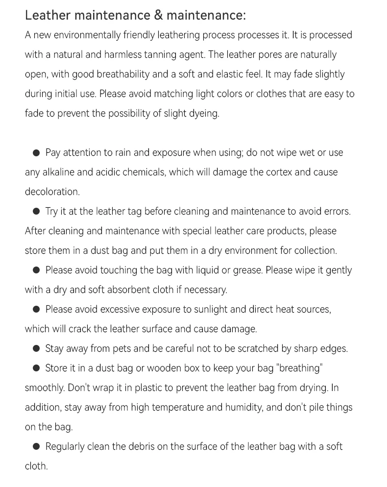 Esta bolsa está hecha de piel de vaca de alta calidad, el revestimiento de piel de vaca utilizado es liviano y delgado, la superficie del cuero es completamente diferente de las propiedades de procesamiento artificial del cuero artificial, conserva completamente las características originales del cuero, no presenta defectos, puede elija no comprarlo si le importa las marcas naturales; Al mismo tiempo, las características del cuero de vaca natural hacen que el cuero sea muy valorado. La piel de vaca natural tiene mejor transpirabilidad, dureza táctil y plasticidad; se utilizan en la artesanía ambiental; Los productos de este proceso artesanal son duraderos y tienen un valor de colección específico.