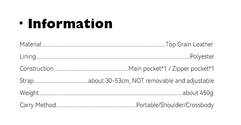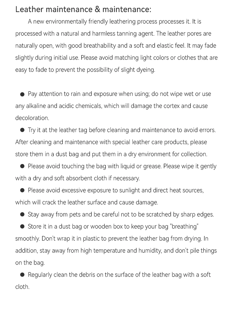 Esta bolsa está hecha de piel de vaca de alta calidad, el revestimiento de piel de vaca utilizado es liviano y delgado, la superficie del cuero es completamente diferente de las propiedades de procesamiento artificial del cuero artificial, conserva completamente las características originales del cuero, no presenta defectos, puede elija no comprarlo si le importa las marcas naturales; Al mismo tiempo, las características del cuero de vaca natural hacen que el cuero sea muy valorado. La piel de vaca natural tiene mejor transpirabilidad, dureza táctil y plasticidad; se utilizan en la artesanía ambiental; Los productos de este proceso artesanal son duraderos y tienen un valor de colección específico.
