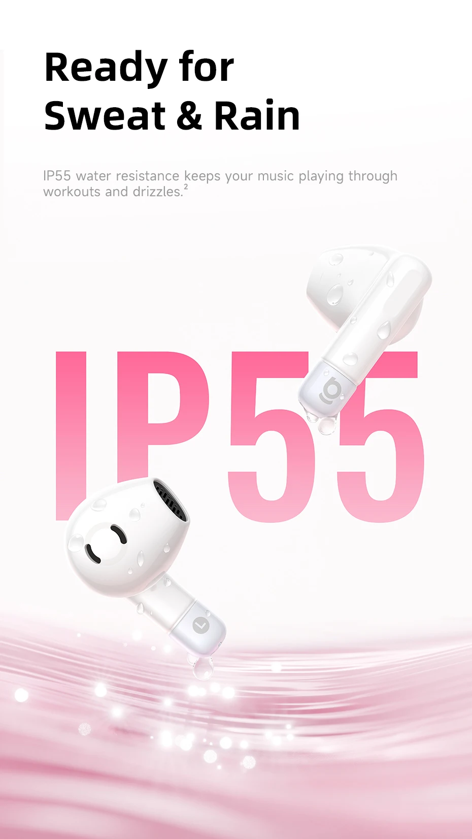 La resistencia al agua IP55 mantiene tu música reproduciéndose durante los entrenamientos y las lloviznas.