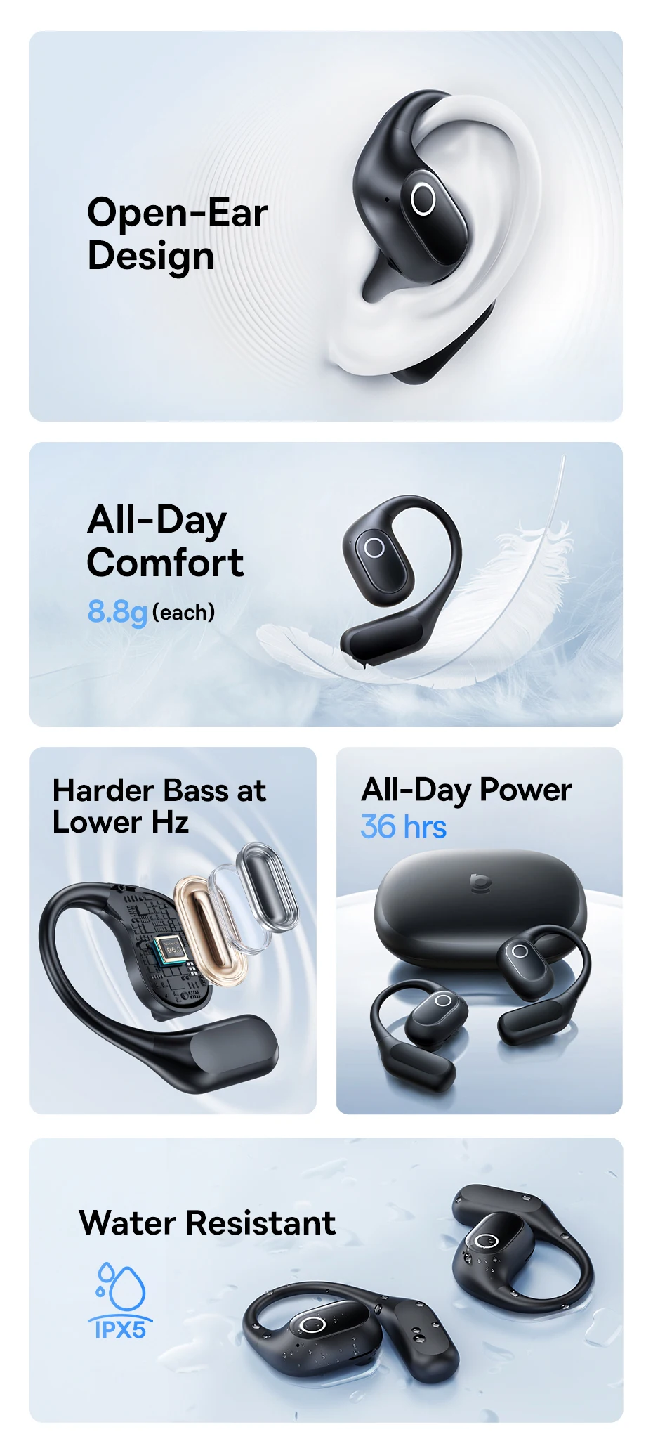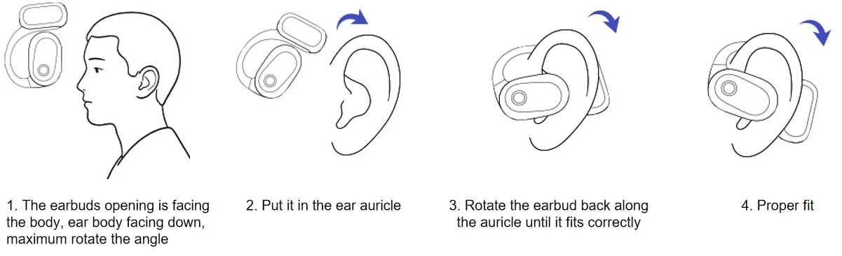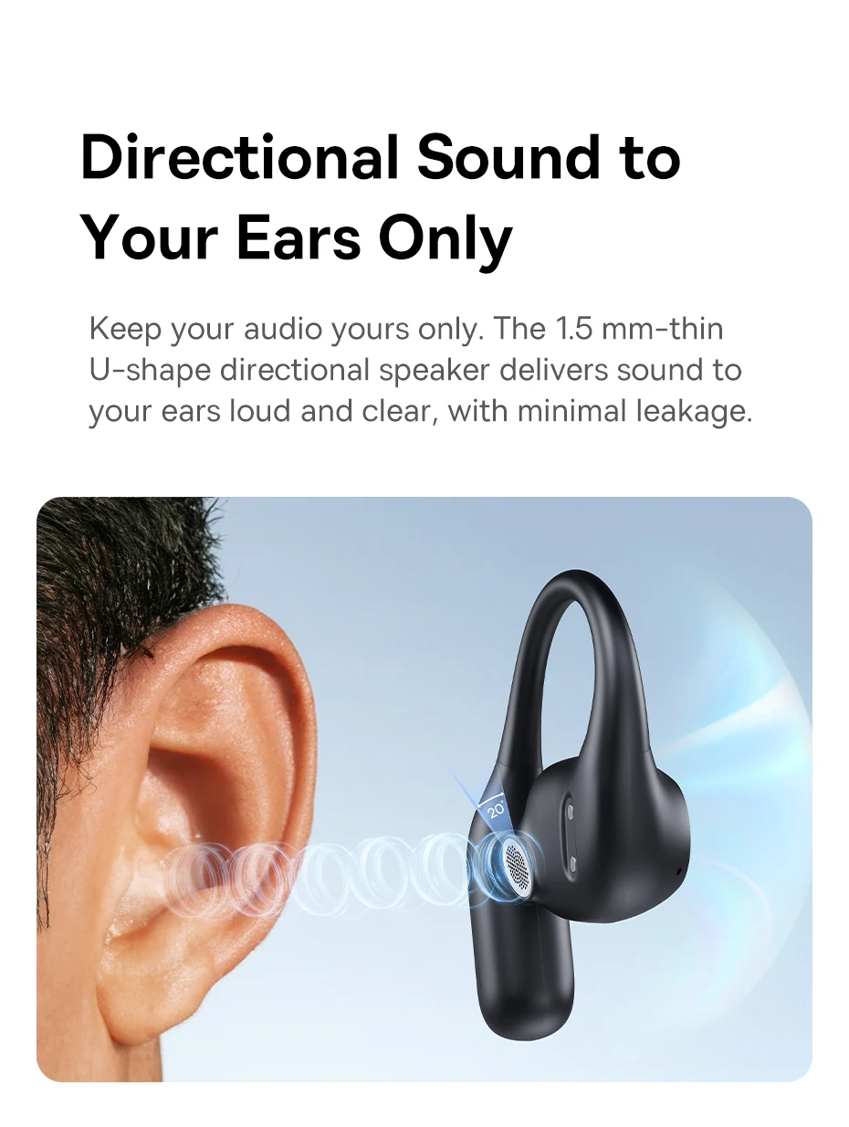 Estos auriculares de oído abierto están diseñados para escuchar con los oídos abiertos sin cancelación activa de ruido.Para obtener la mejor experiencia de sonido, siga la guía de uso para lograr un ajuste seguro y un rendimiento de audio óptimo.
