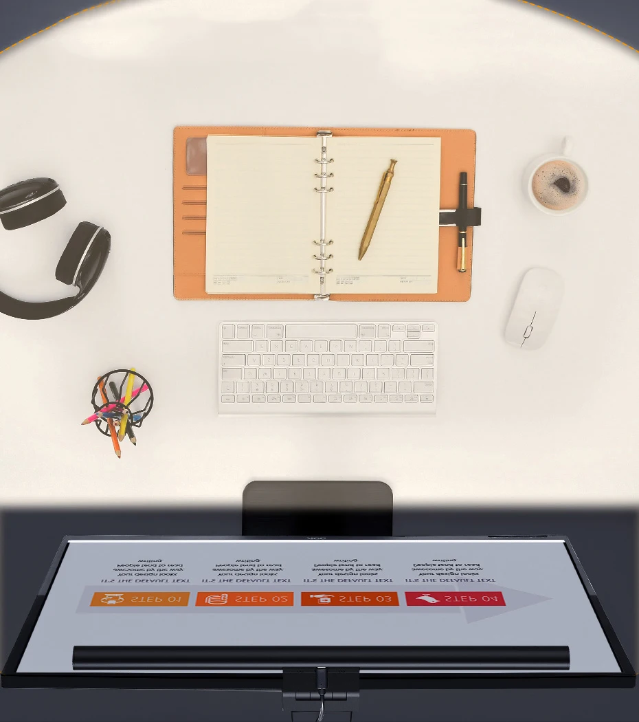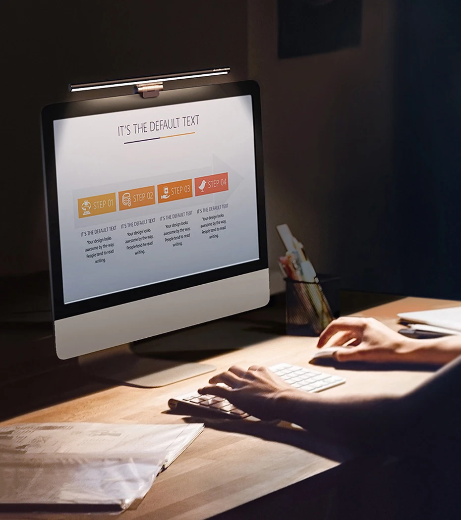 Fuente de luz LED recta para una amplia área iluminada sin rincones muertos. El cuerpo de la lámpara está diseñado con un ángulo de inclinación para iluminar el teclado y los documentos frente a la pantalla.
