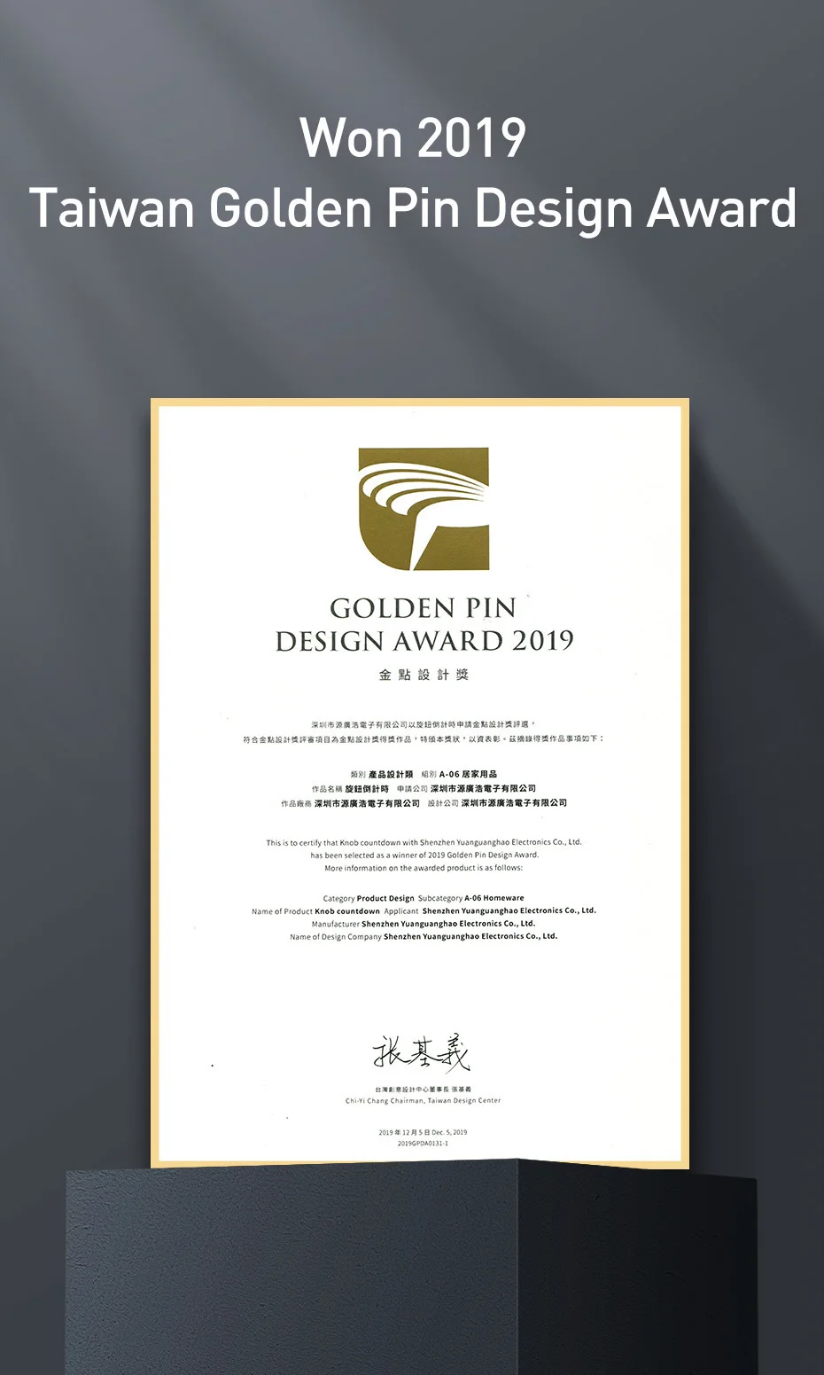 Ganó el premio de diseño de Pin Dorado de Taiwán 2019