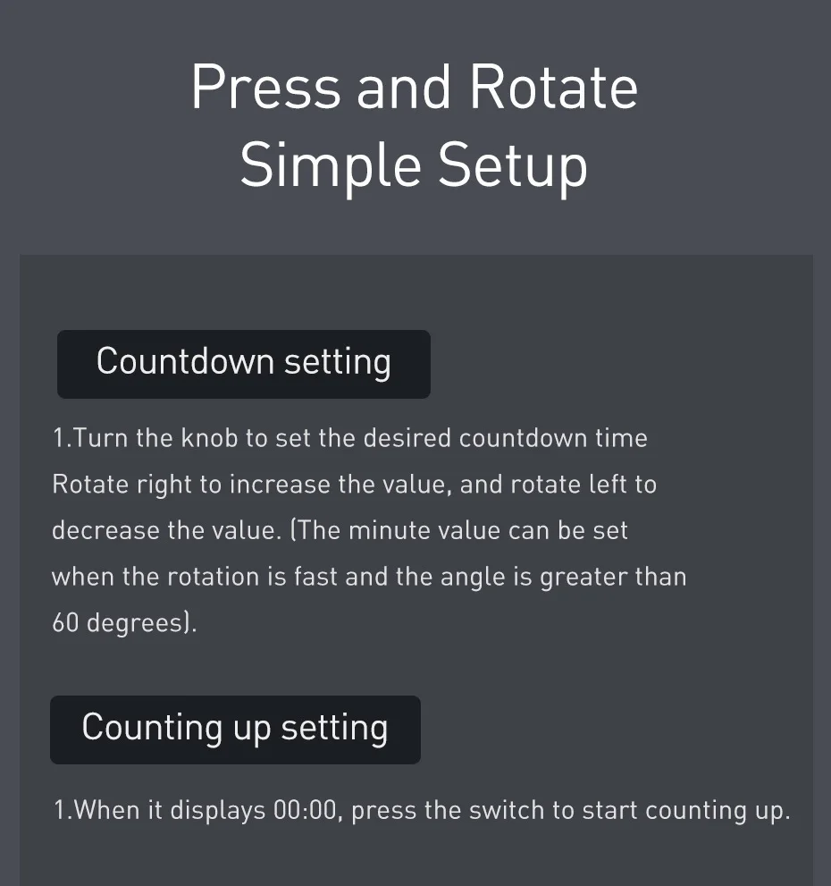 Configuración de cuenta regresiva: gire la perilla para configurar el tiempo de cuenta regresiva deseado.Gire hacia la derecha para aumentar el valor y gire hacia la izquierda para disminuir el valor.(El valor de los minutos se puede configurar cuando la rotación es rápida y el ángulo es superior a 60 grados)