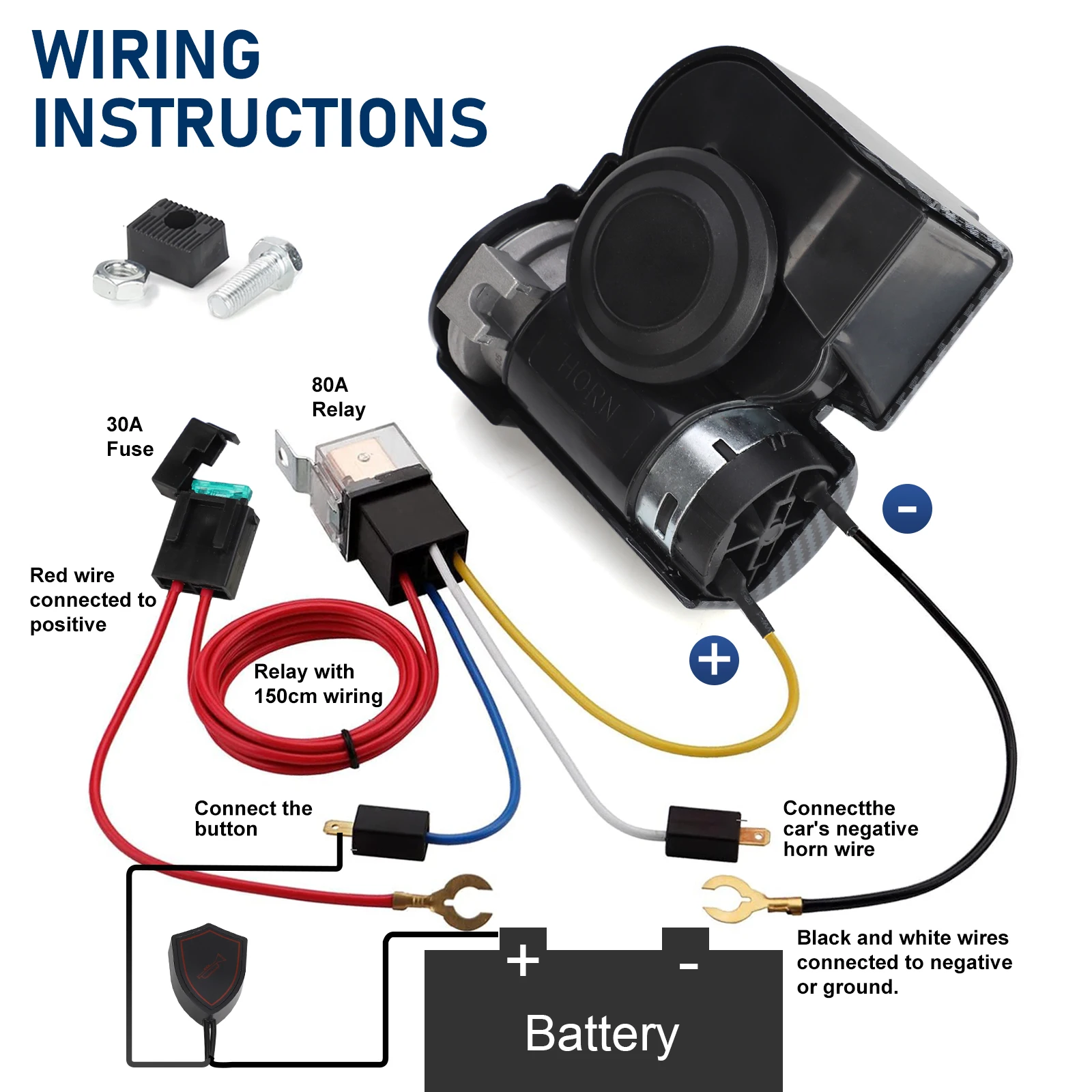 - La bomba de aire emite un sonido chirriante pero la bocina no suena, lo que significa que los terminales positivo y negativo debajo de la bomba de aire están conectados al revés.El cable amarillo debe insertarse en el polo positivo y el cable negro en el polo negativo.