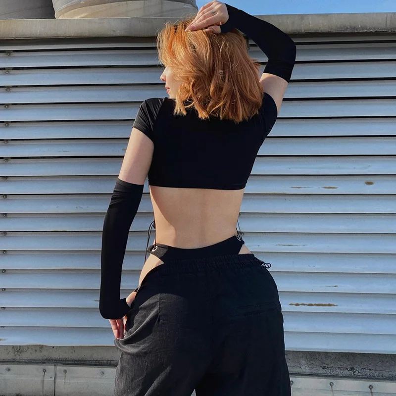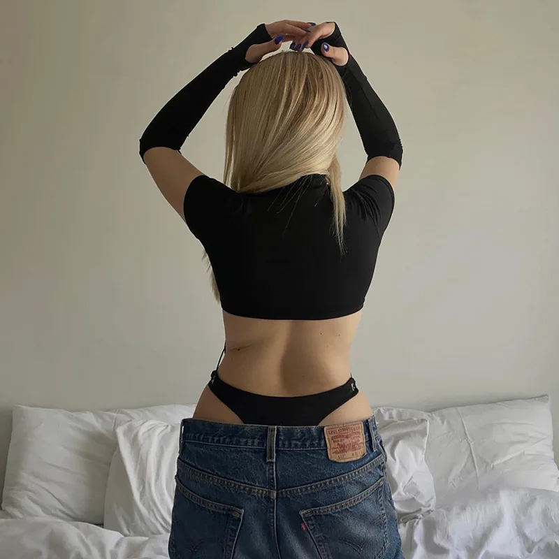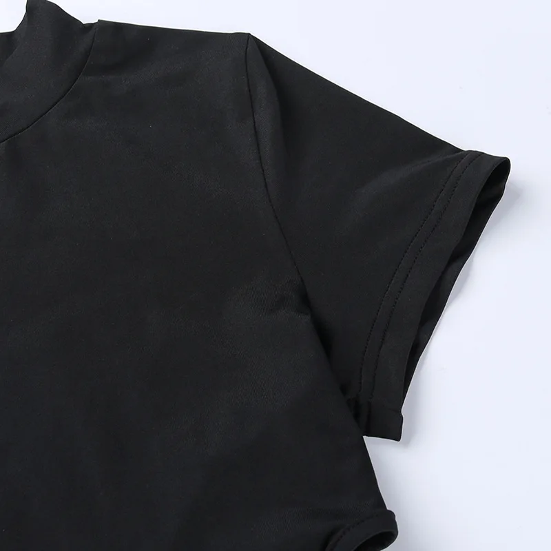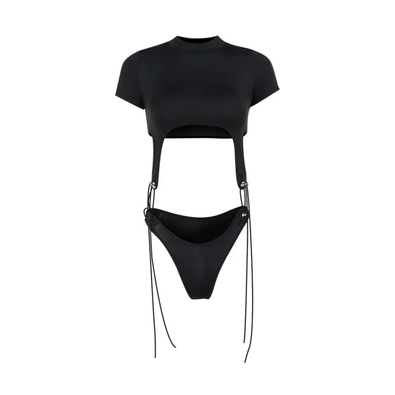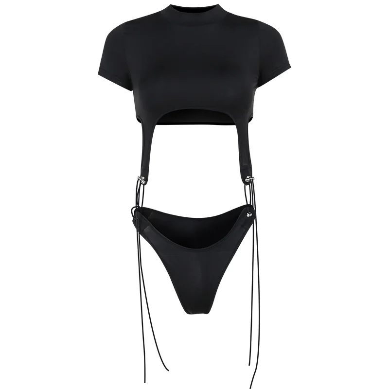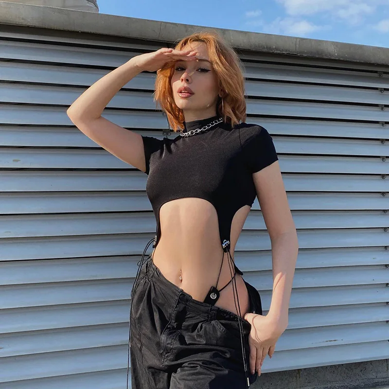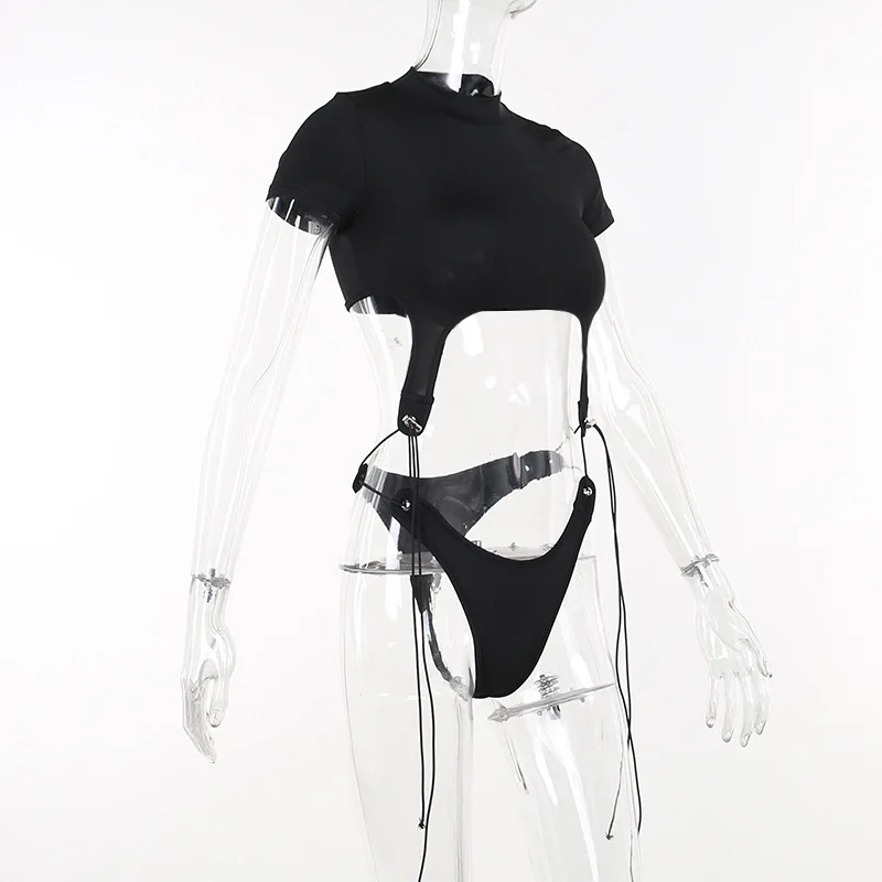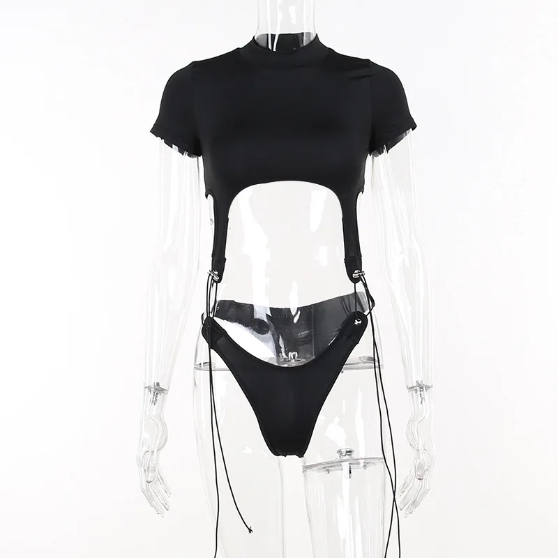 Short Sleeve Bodysuit, Mock Neck Women Y2k Clothes, Hollow Out One-Piece Body Feminino, Lace Up Club Outfits, Sexy Lingerie