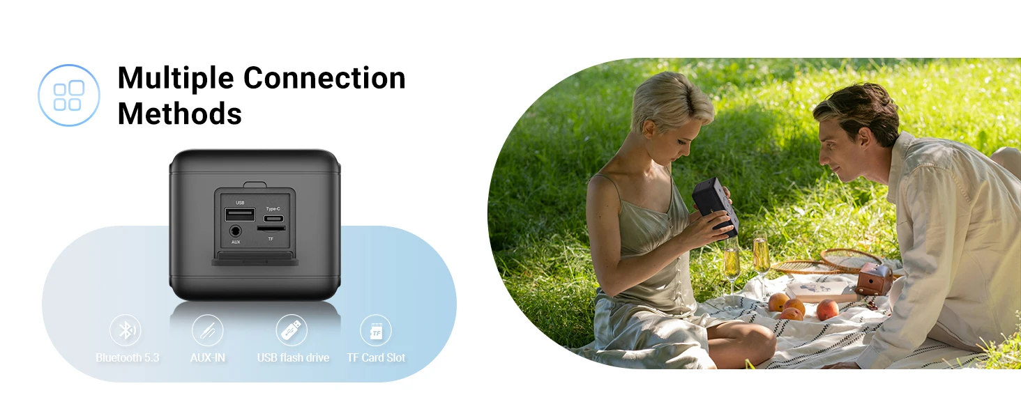 Bluetooth 5.3 proporciona una conexión confiable a dispositivos emparejados dentro de un radio de dieciocho metros.También tiene ranura para unidad flash USB, ranura para tarjeta TF, ranura para línea de audio.