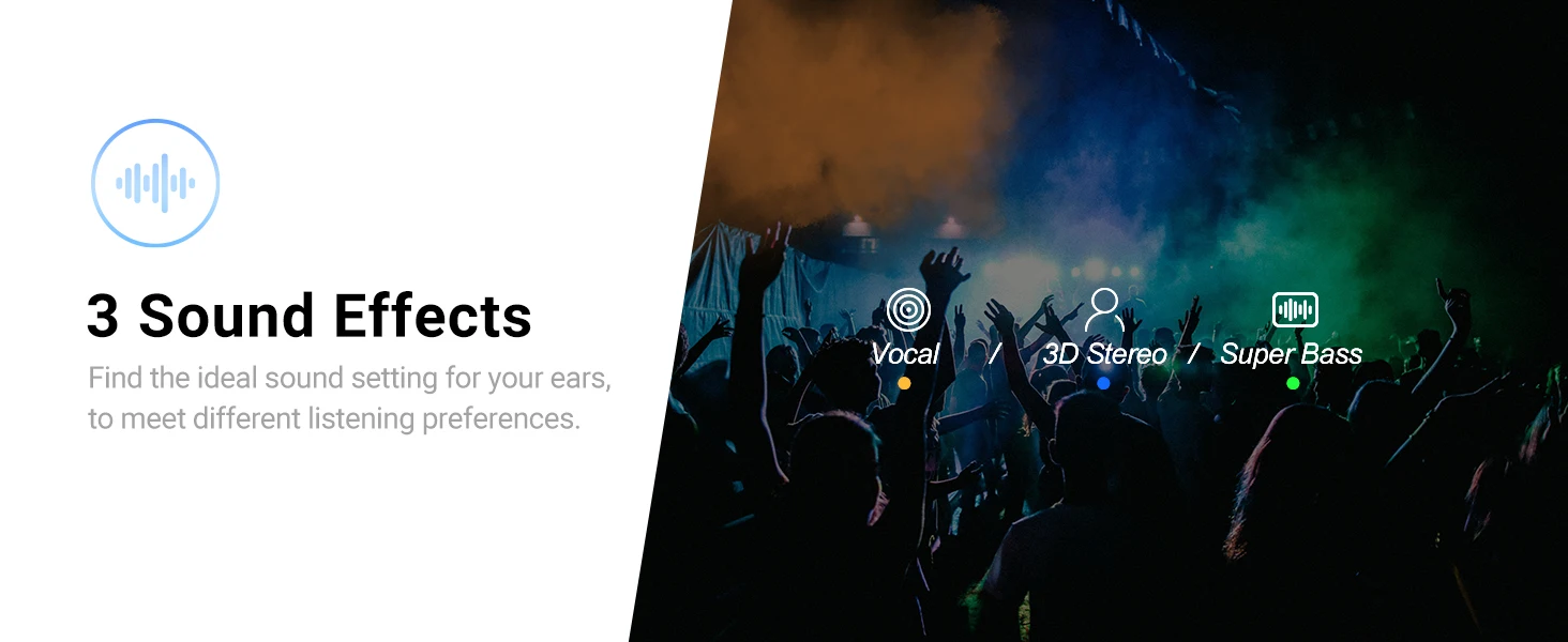 Ajusta el modo de la caja de sonido en 3 niveles: desde tonos suaves hasta graves potentes y contundentes. Así, puedes elegir entre voz, super bass o estéreo 3D.