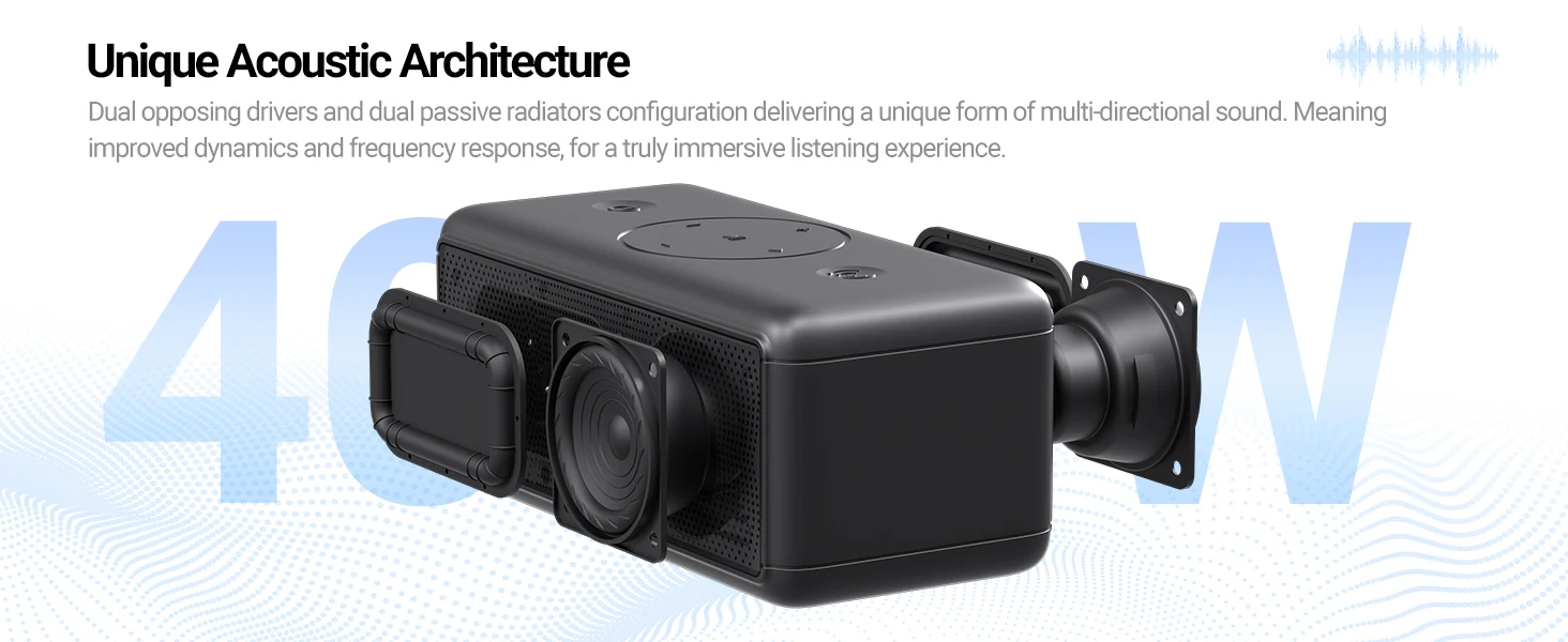 Tecnología única de chip de audio DSP.Analiza y amplifica las frecuencias graves de la música en tiempo real. Emite un sonido potente de hasta 40 vatios.