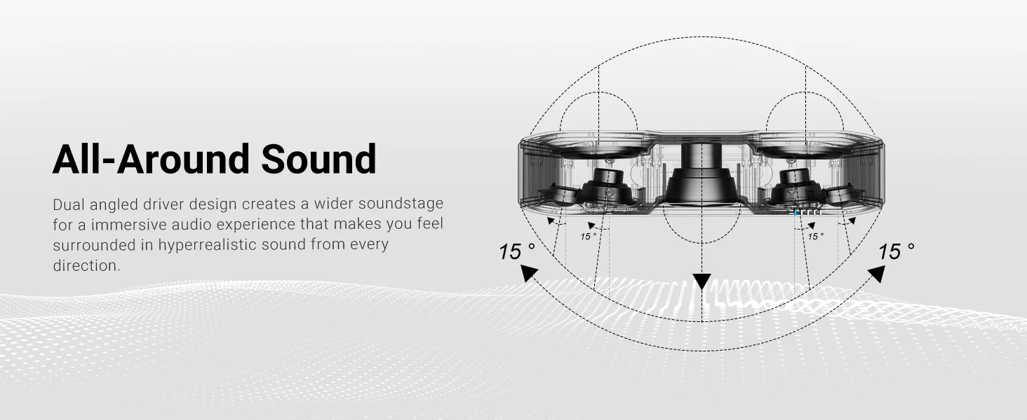Los 15°La inclinación hacia afuera ayuda a expandir el ancho del escenario sonoro para proporcionar una mejor sensación de espacio. Sumérgete en un potente sonido 360.°audio.