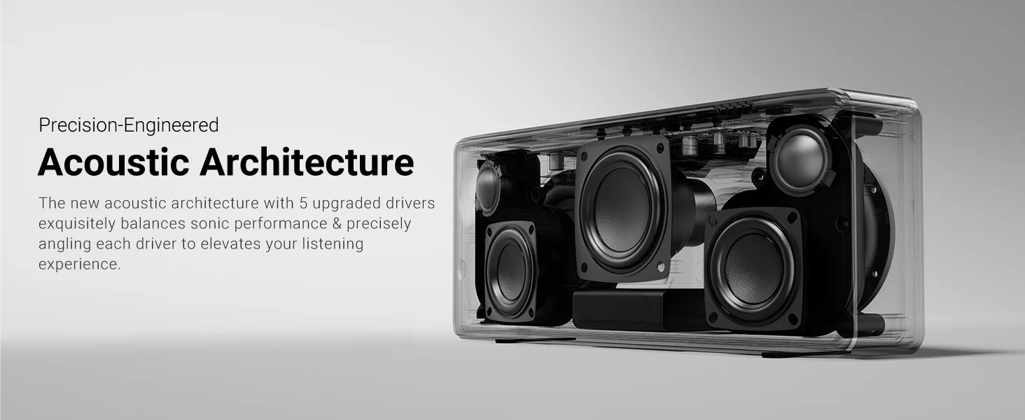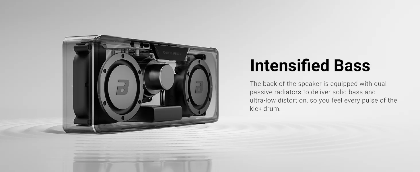 La parte trasera del altavoz está equipada con radiadores pasivos duales para ofrecer unos graves sólidos y una distorsión ultrabaja, para que sientas cada pulso del bombo.