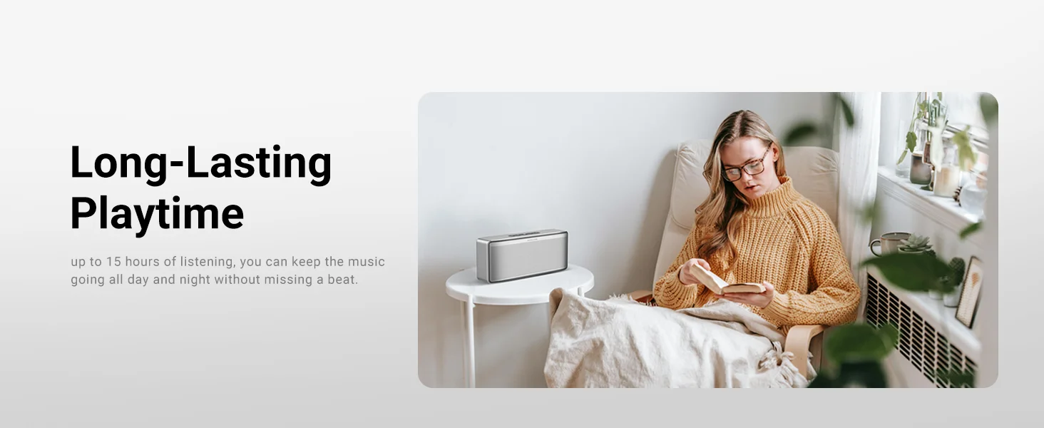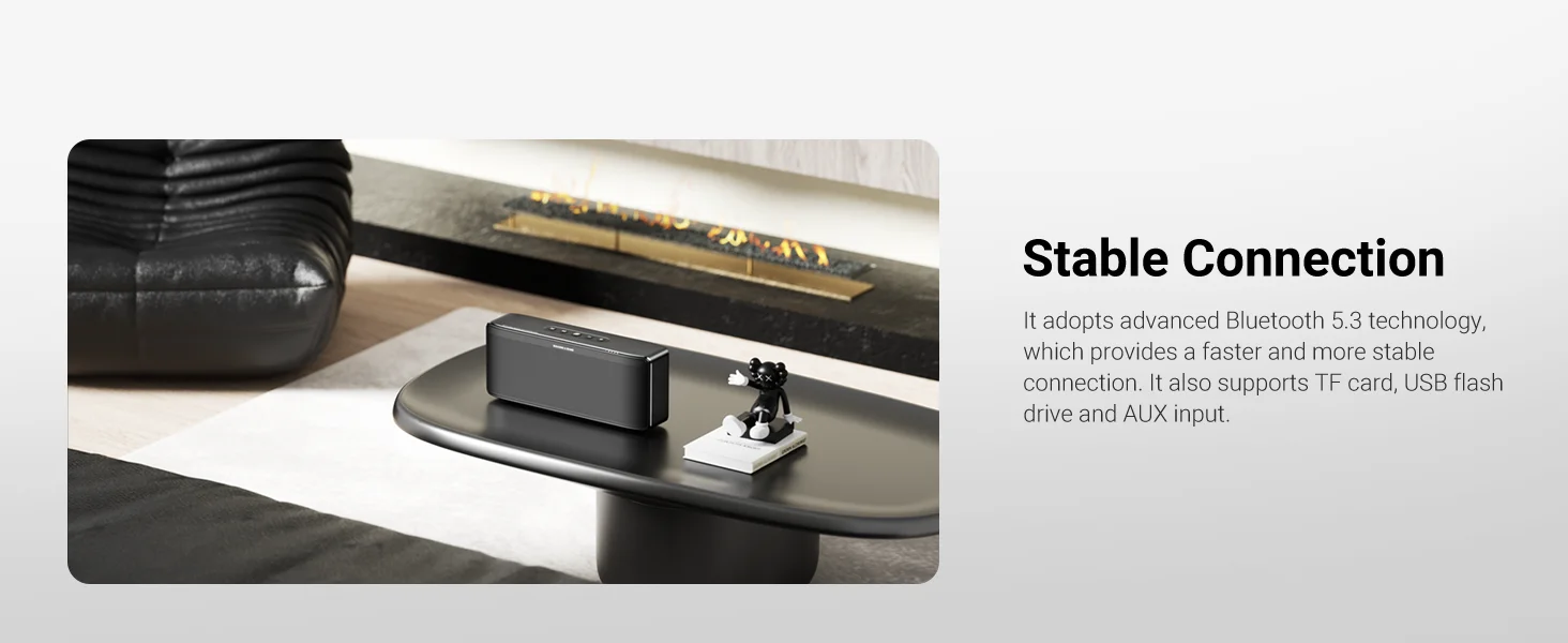 Adopta la avanzada tecnología Bluetooth 5.3, que ofrece una conexión más rápida y estable. También es compatible con tarjetas TF, unidades USB y entrada AUX.