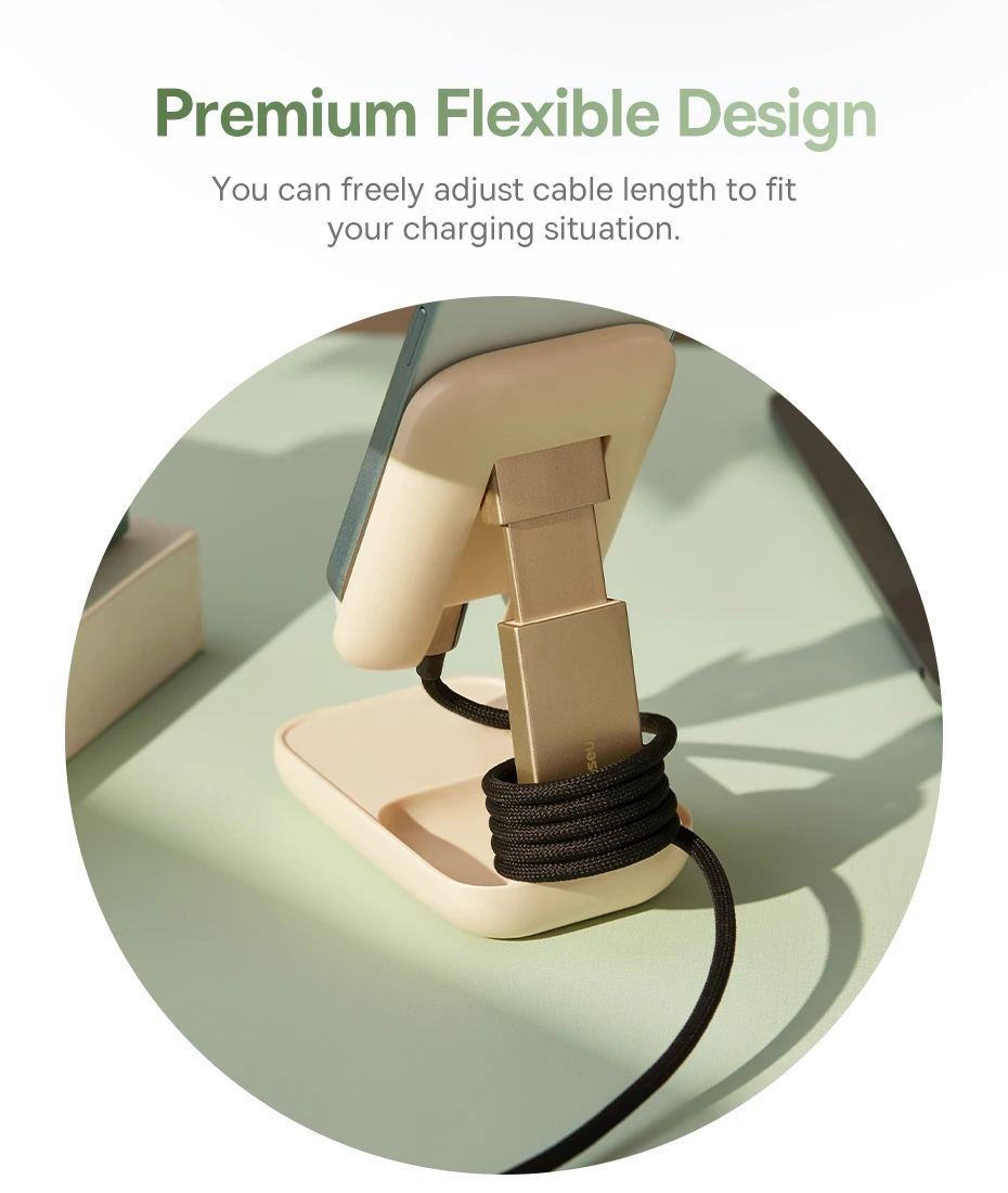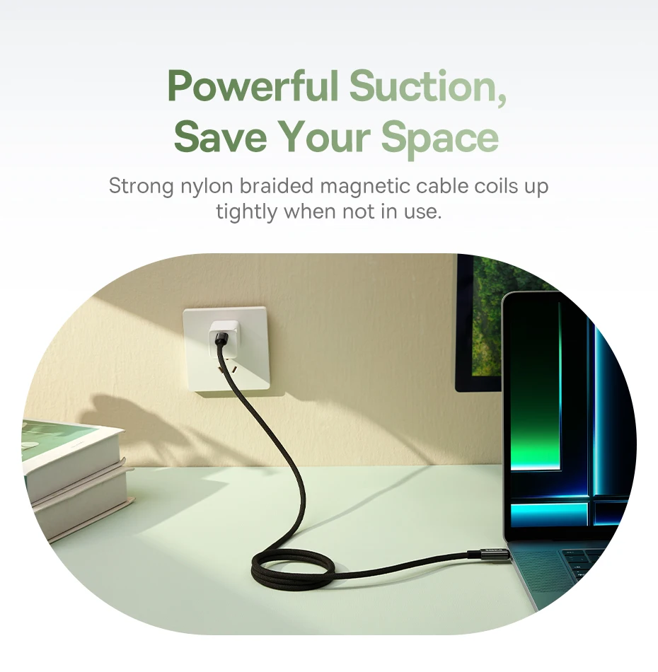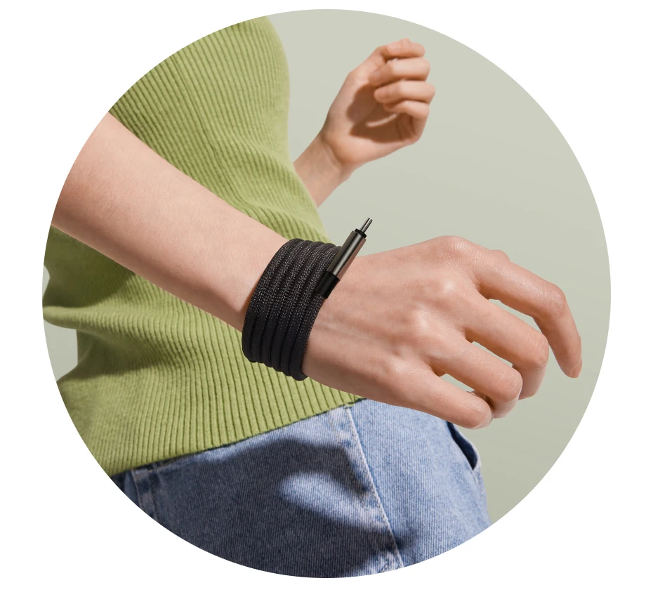 El cable magnético trenzado de nailon resistente se enrolla firmemente cuando no está en uso.