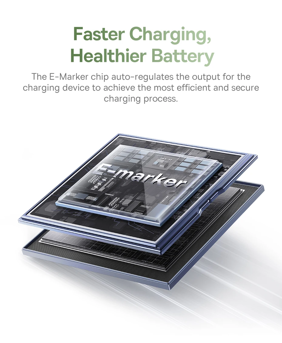 El chip E-Marker regula automáticamente la salida del dispositivo de carga para lograr el proceso de carga más eficiente y seguro.