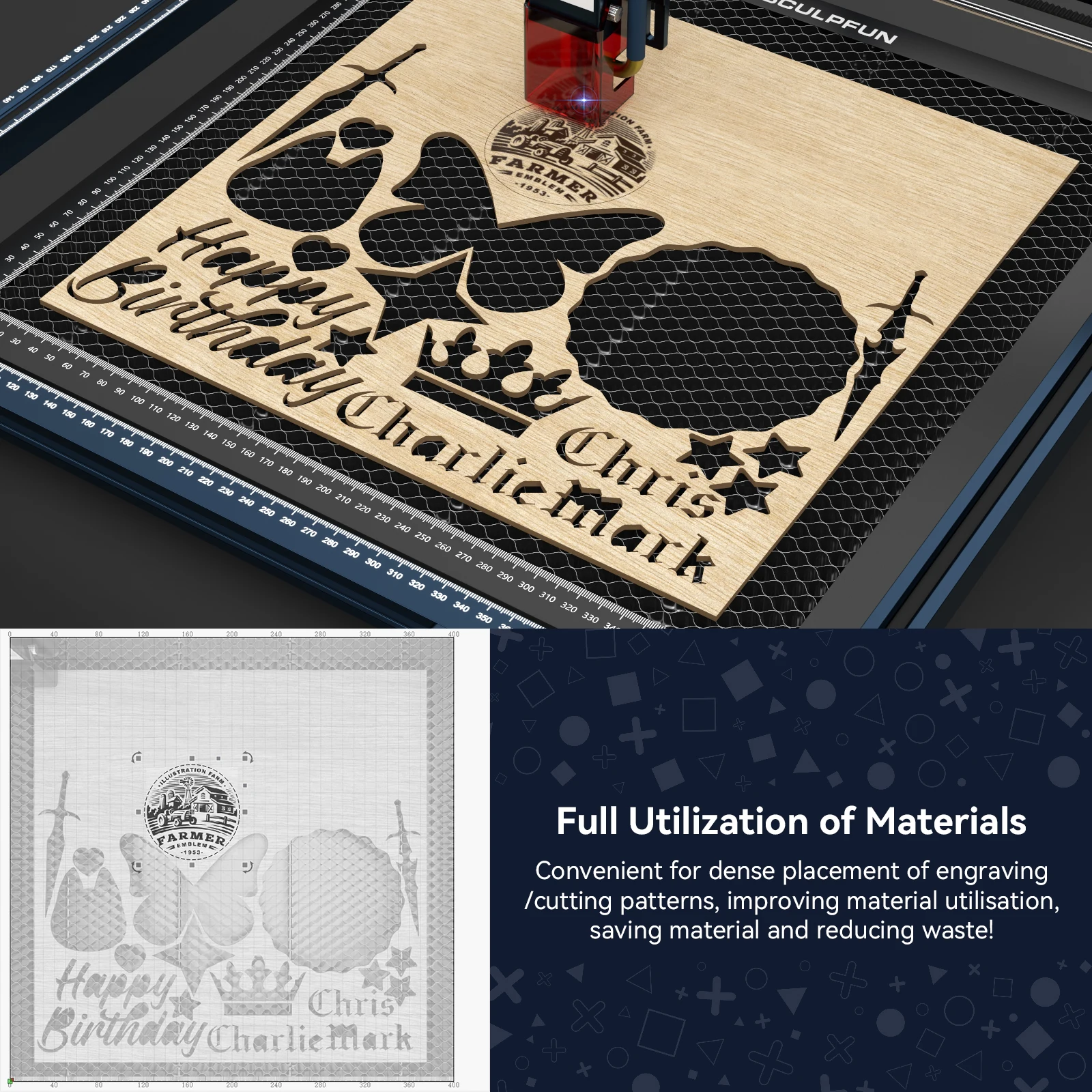 2.Posicionamiento preciso: la cámara SCULPFUN CAM500 se adapta perfectamente a la función CAM del software Lightburn, que puede identificar la posición de los objetos grabados a través de la cámara, con una desviación de posicionamiento inferior a 1 mm.