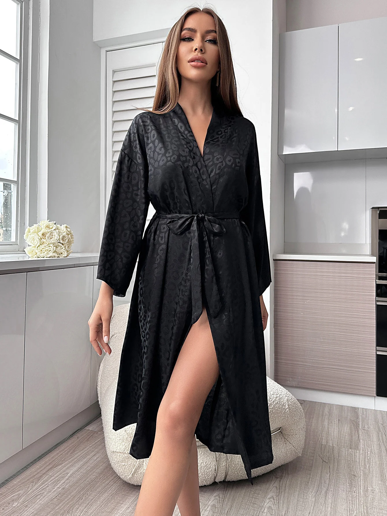 Con mangas largas, esta bata ofrece protección contra los elementos a la vez que añade un toque de elegancia.