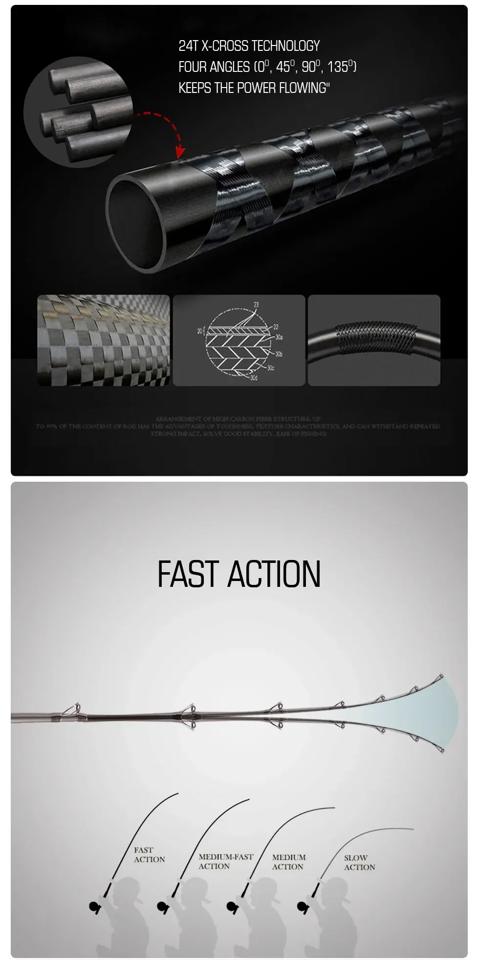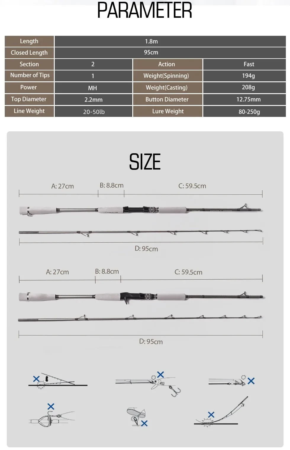 Punta X-cross-Esta caña está equipada con una punta de fuerza, melodía MH, que puede soportar un peso de señuelo de 80-250 g.