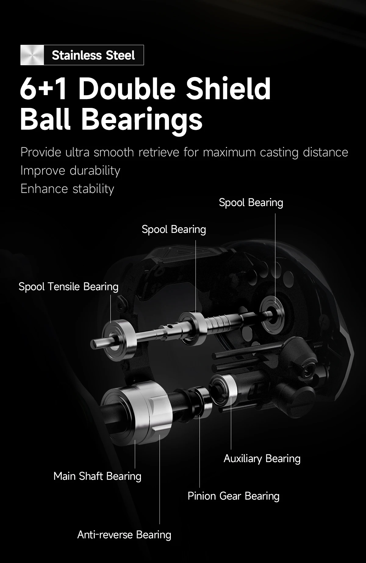?6 + 1 rodamientos de bolas de acero inoxidable de doble blindaje, que garantizan un rendimiento y una fiabilidad duraderos.