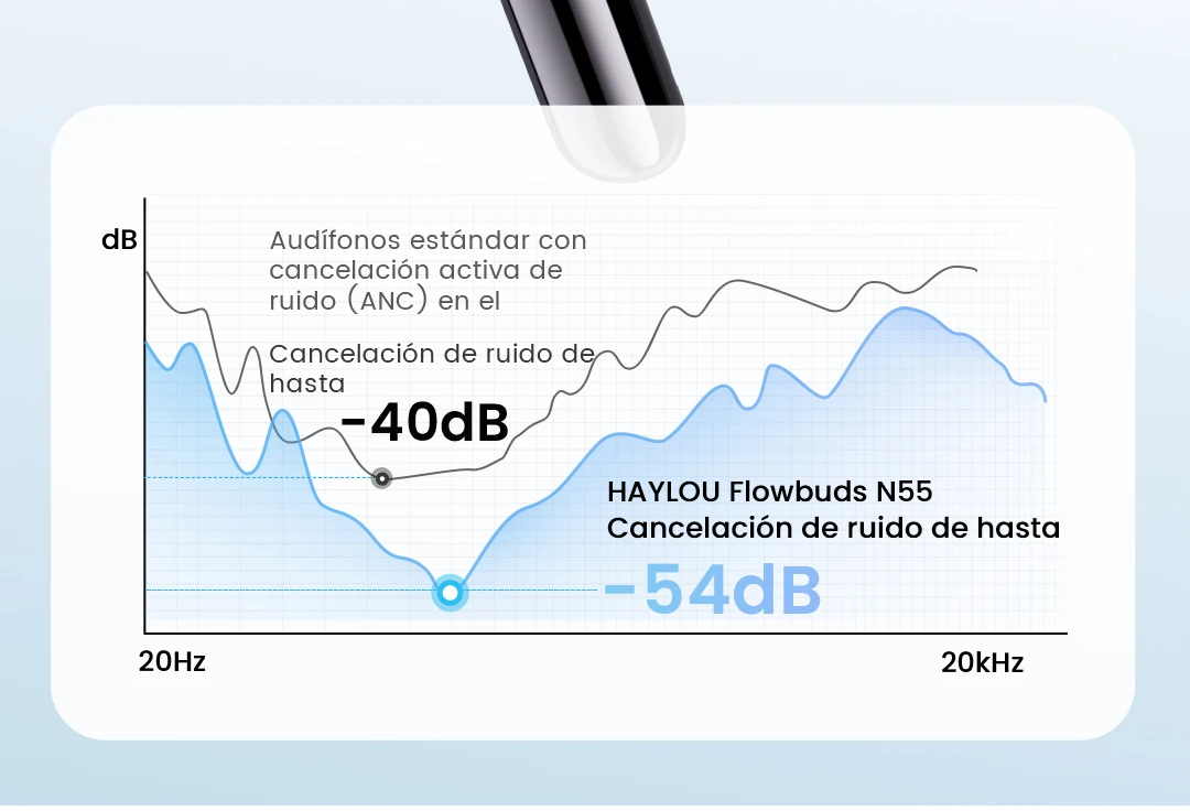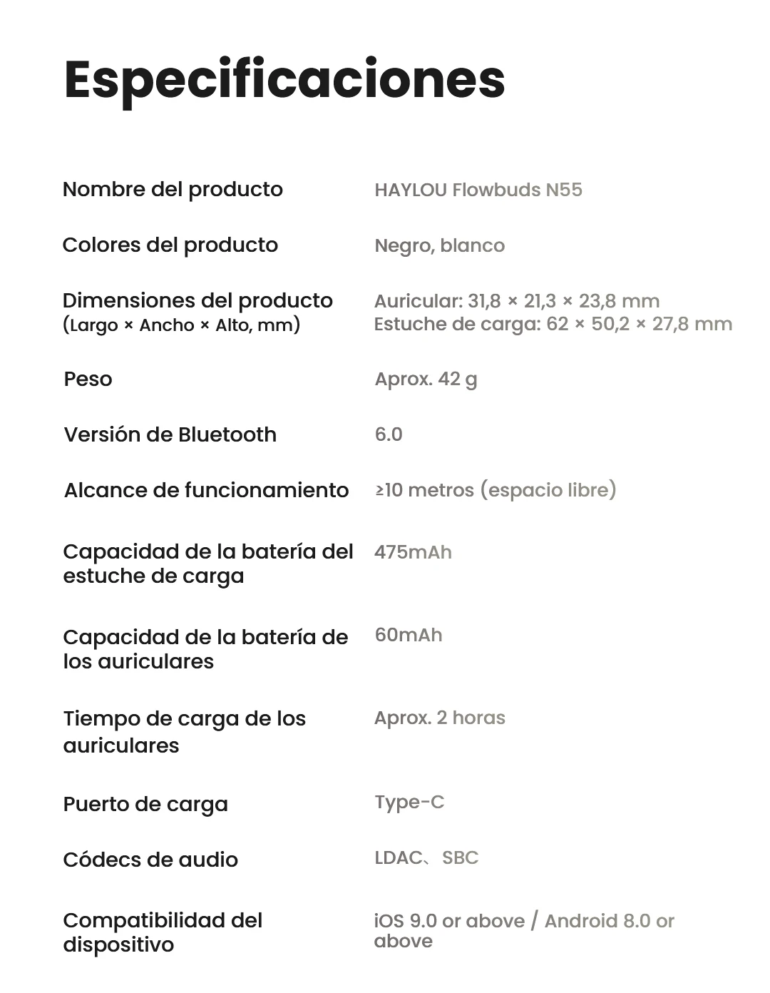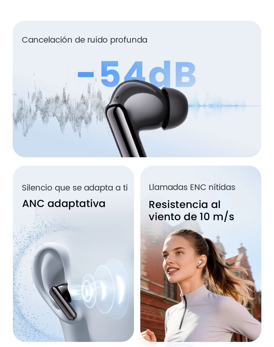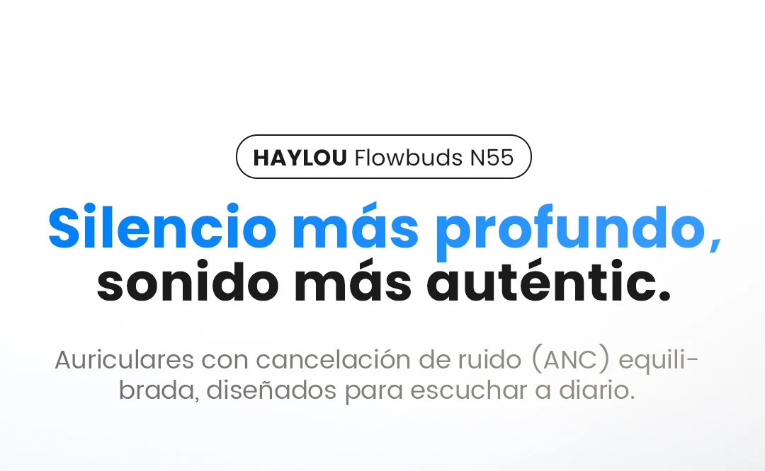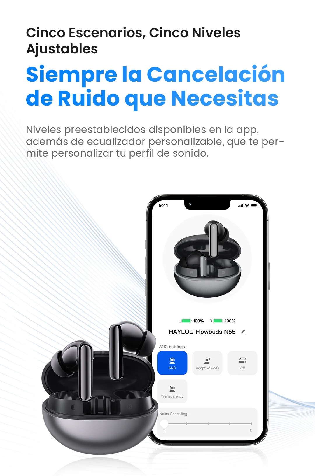 Certificación LDAC y Hi-Res Wireless: Equipado con un controlador dinámico recubierto de titanio de 12,4 mm y un algoritmo de mejora de graves transitorios, que ofrece detalles precisos de alta y baja frecuencia.Los agudos son claros y aireados, como una presentación en vivo, mientras que los graves son potentes y profundamente extendidos, ofreciendo una experiencia musical y multimedia inmersiva en cualquier momento y lugar.Cancelación de ruido adaptativa de 54 dB: HAYLOU Flowbuds N55 Cancelación activa de ruido de banda ultraancha de hasta -54 dB con detección del entorno del canal auditivo.Escanea continuamente el microambiente interno del auricular (calidad del sellado, cambios de presión de aire), optimizando dinámicamente los parámetros de cancelación activa de ruido (ANC) para ambos oídos.Desde el ruido del metro hasta el zumbido del teclado de la oficina, actúa como un "vacío de ondas sonoras", creando una zona de silencio dedicada para escuchar música pura y trabajar con concentración.