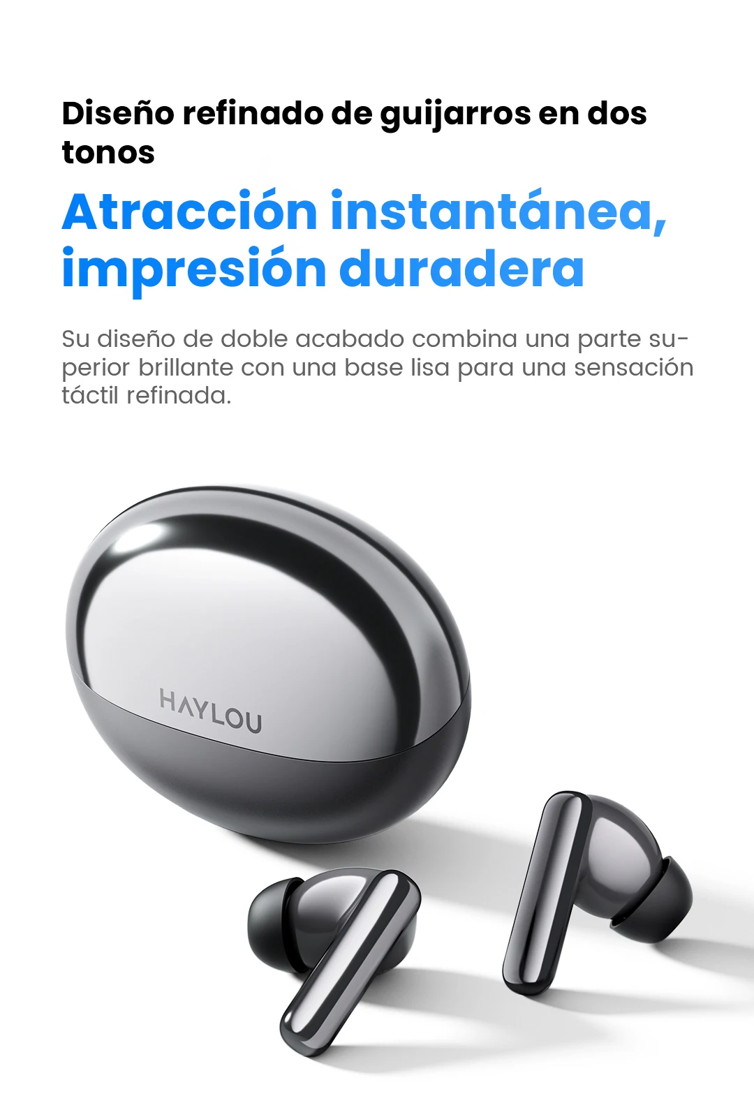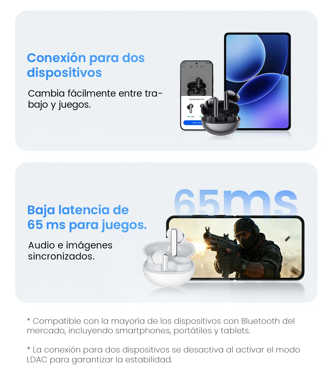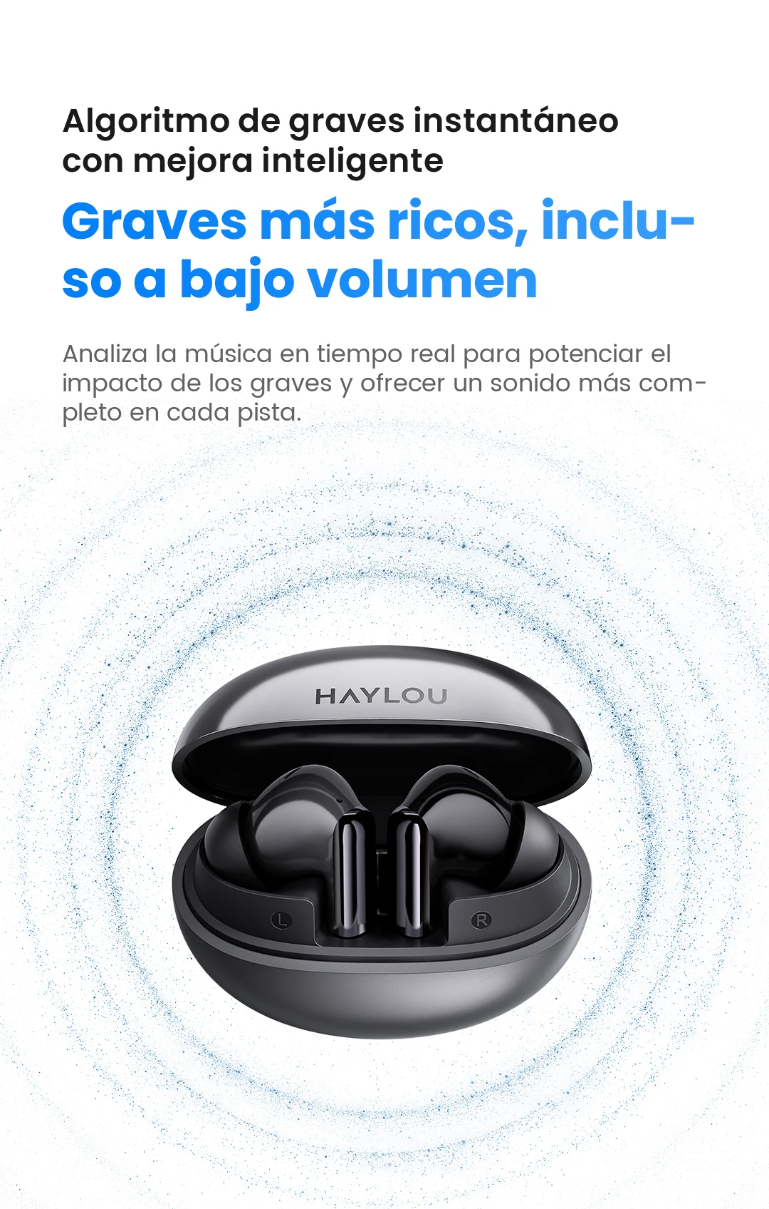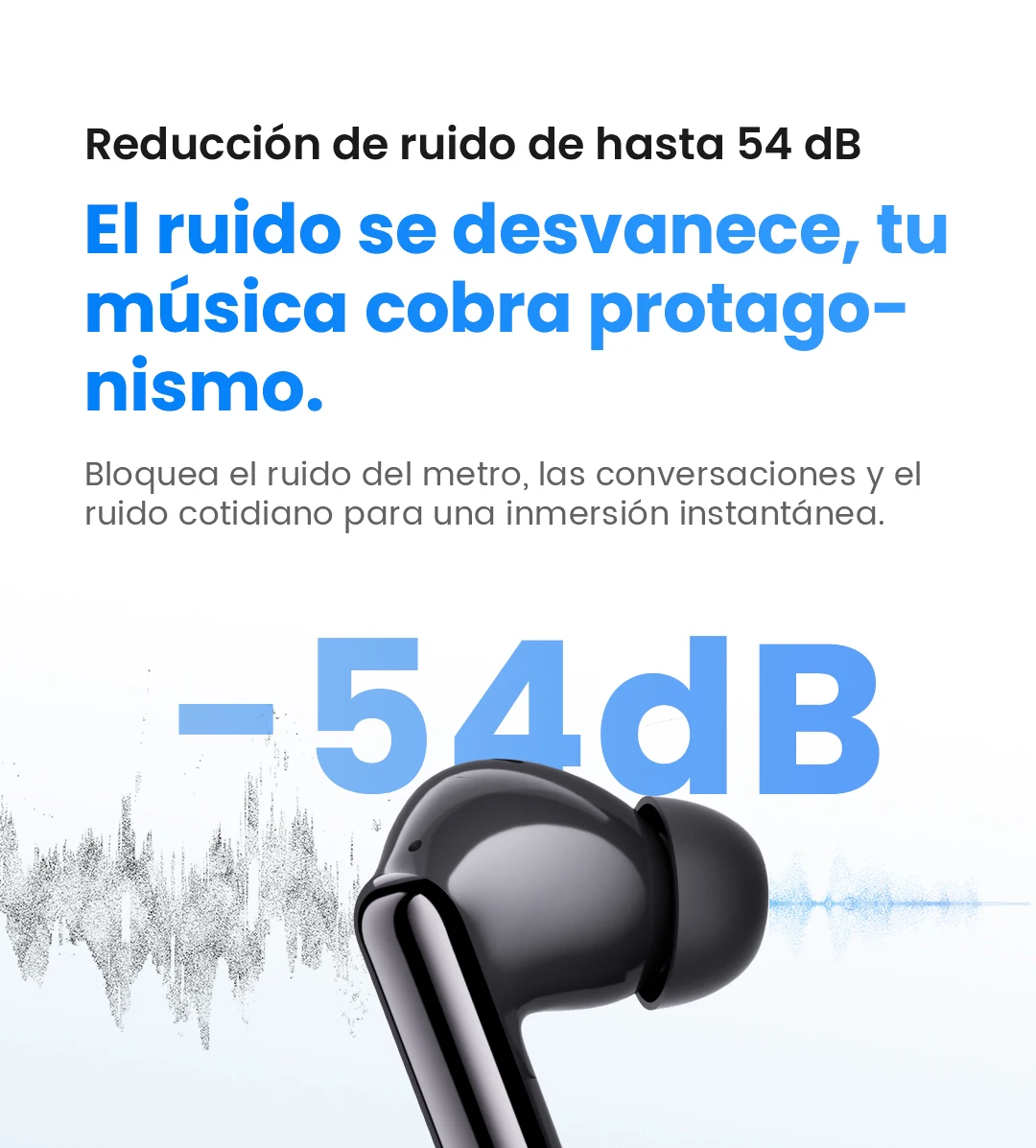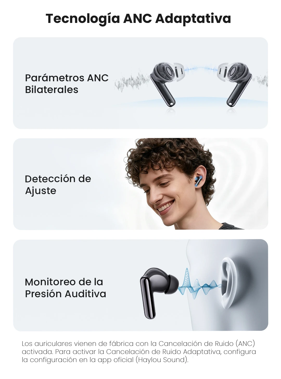 Certificación LDAC y Hi-Res Wireless: Equipado con un controlador dinámico recubierto de titanio de 12,4 mm y un algoritmo de mejora de graves transitorios, que ofrece detalles precisos de alta y baja frecuencia.Los agudos son claros y aireados, como una presentación en vivo, mientras que los graves son potentes y profundamente extendidos, ofreciendo una experiencia musical y multimedia inmersiva en cualquier momento y lugar.Cancelación de ruido adaptativa de 54 dB: HAYLOU Flowbuds N55 Cancelación activa de ruido de banda ultraancha de hasta -54 dB con detección del entorno del canal auditivo.Escanea continuamente el microambiente interno del auricular (calidad del sellado, cambios de presión de aire), optimizando dinámicamente los parámetros de cancelación activa de ruido (ANC) para ambos oídos.Desde el ruido del metro hasta el zumbido del teclado de la oficina, actúa como un "vacío de ondas sonoras", creando una zona de silencio dedicada para escuchar música pura y trabajar con concentración.