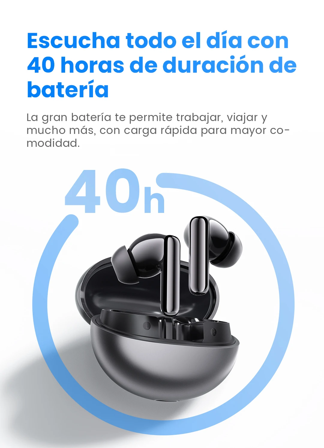 Duración extendida de la batería: Hasta 12 horas de reproducción con una sola carga; con el estuche de carga, la reproducción total alcanza las 40 horas para una semana completa de desplazamientos sin necesidad de recargar.Una carga rápida de 10 minutos proporciona 1,5 horas de escucha.