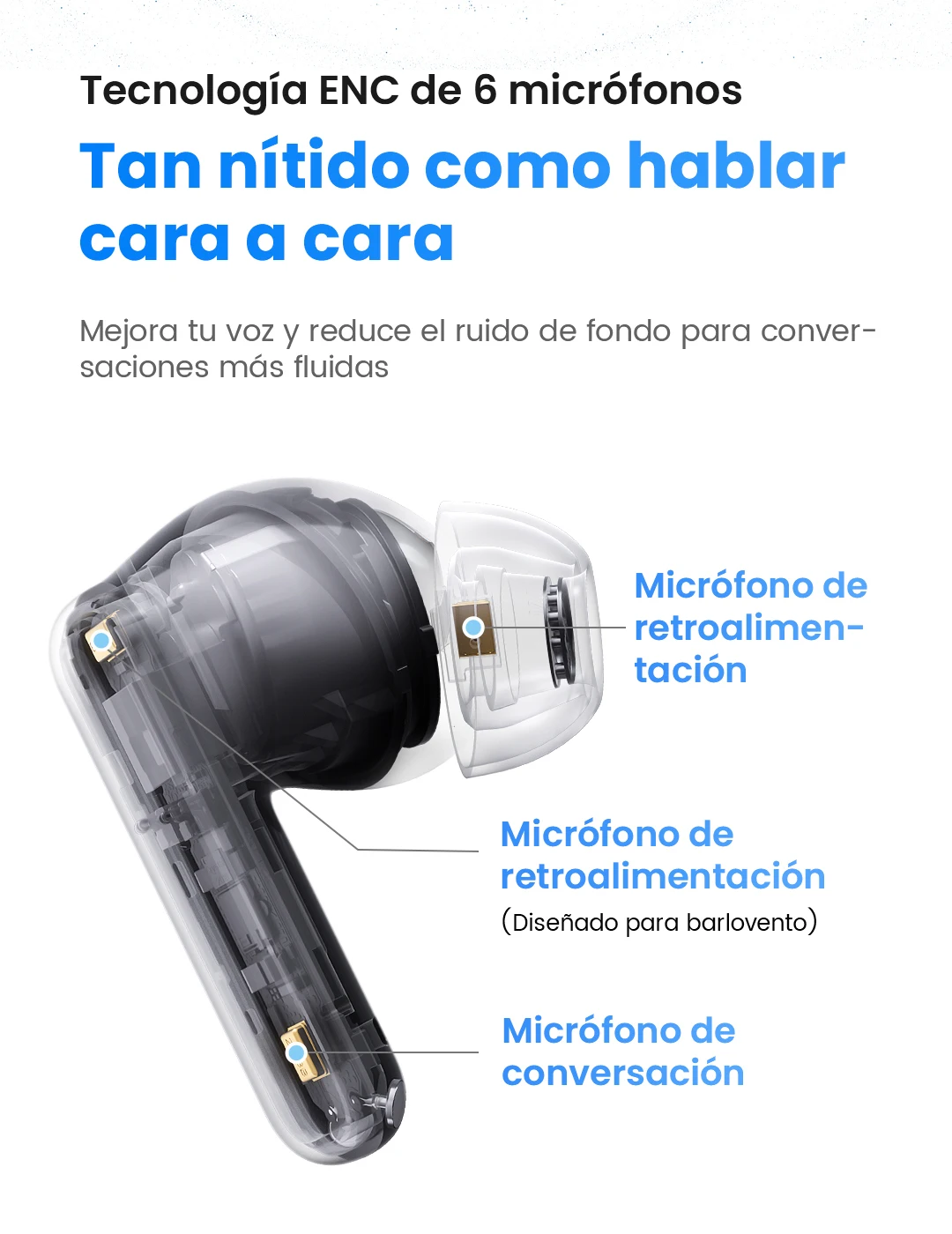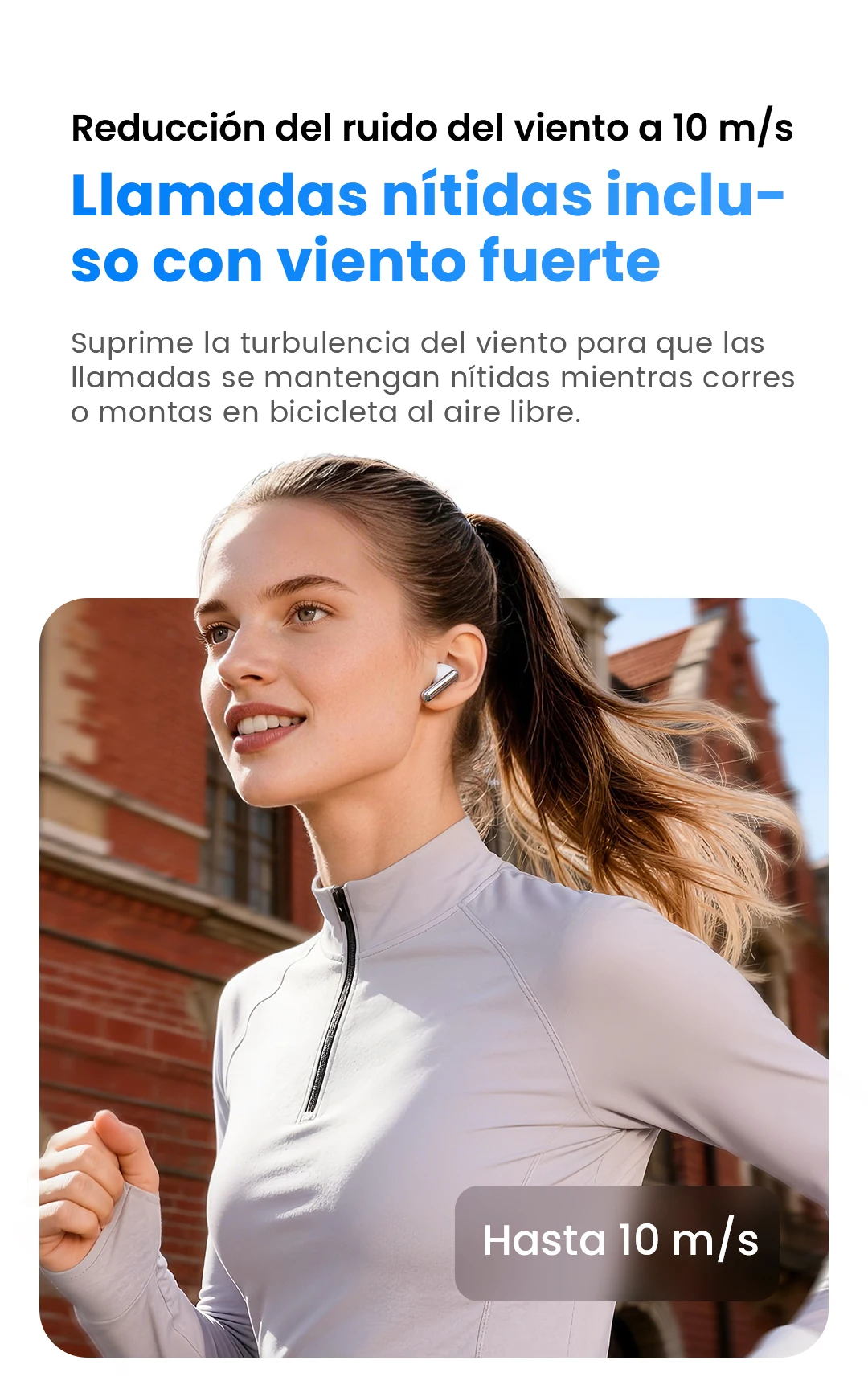6 micrófonos ENC para llamadas claras + Resistencia al viento de 10 m/s: Arreglo de micrófonos múltiples con algoritmos inteligentes que detectan y cancelan el ruido del viento en tiempo real.Ya sea caminando al aire libre, haciendo ejercicio, participando en videoconferencias o realizando llamadas de voz, su voz permanece clara y la comunicación se mantiene fluida.