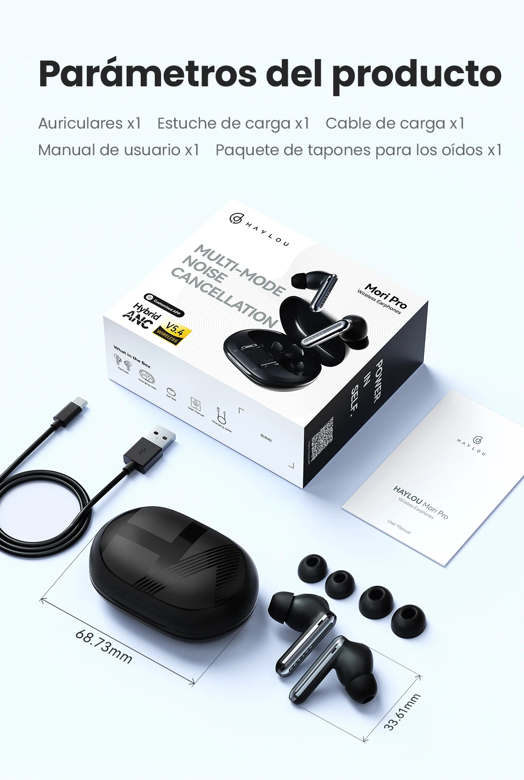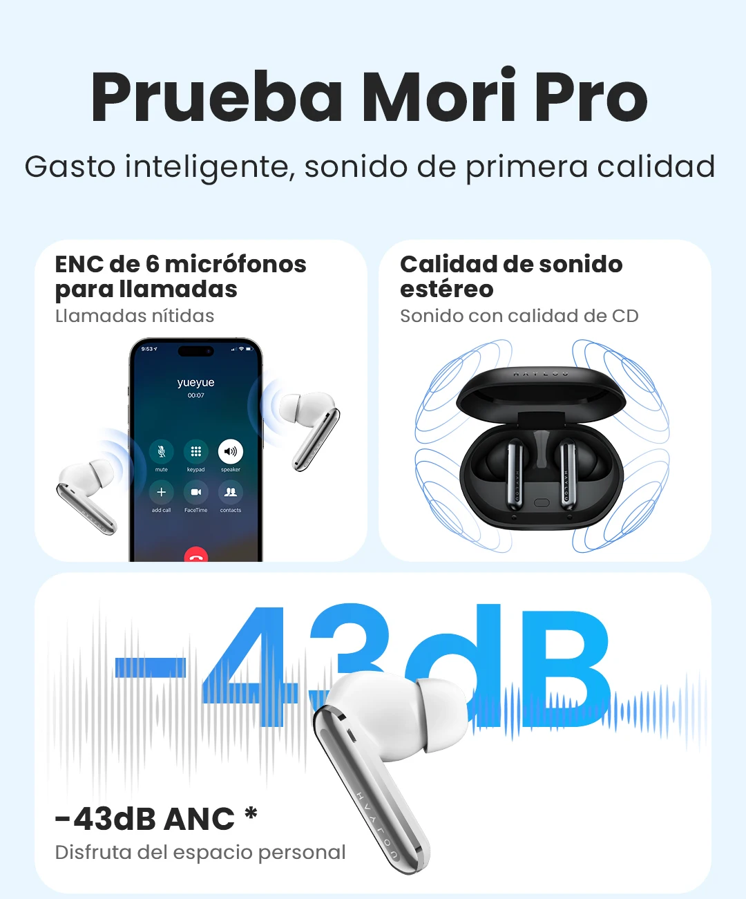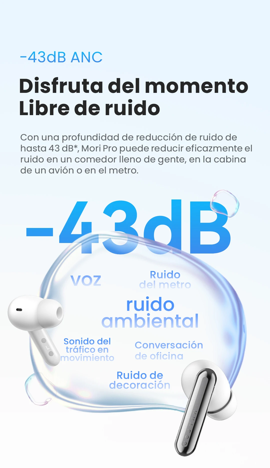 -43dB ANC Cancelación de ruido Profundidad: Con una profundidad de reducción de ruido de hasta 43dB *, Mori Pro puede reducir eficazmente el ruido en una cantimplora abarrotada, en la cabina de un avión o en el metro.