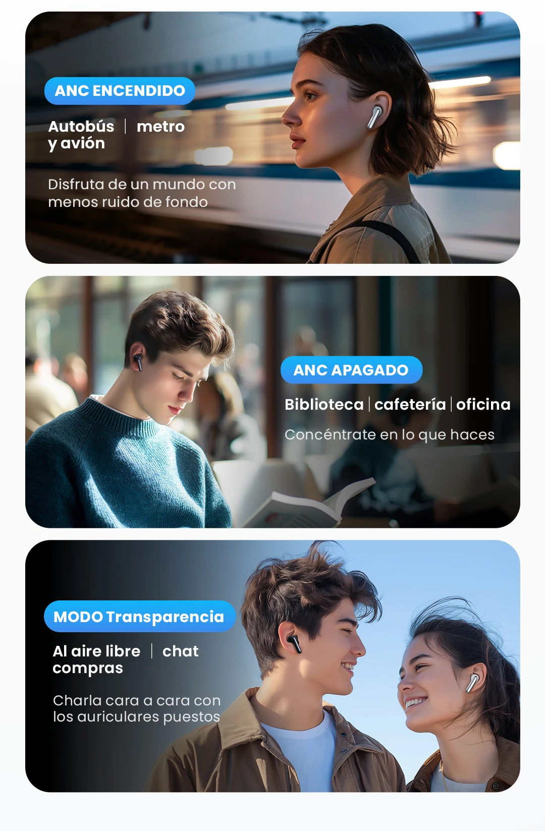 3 modos de cancelación de ruido ANC: ay 3 modos de cancelación de ruido para diferentes entornos y tres niveles ajustables para cada modo para su elección.