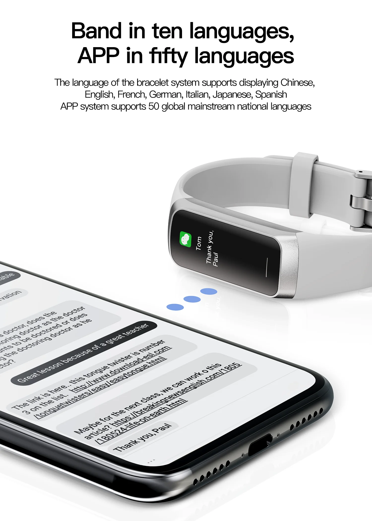 • Idioma de la pulsera: chino/Inglés/Español/chino tradicional/francés/alemán/italiano/japonés/ruso/holandés
