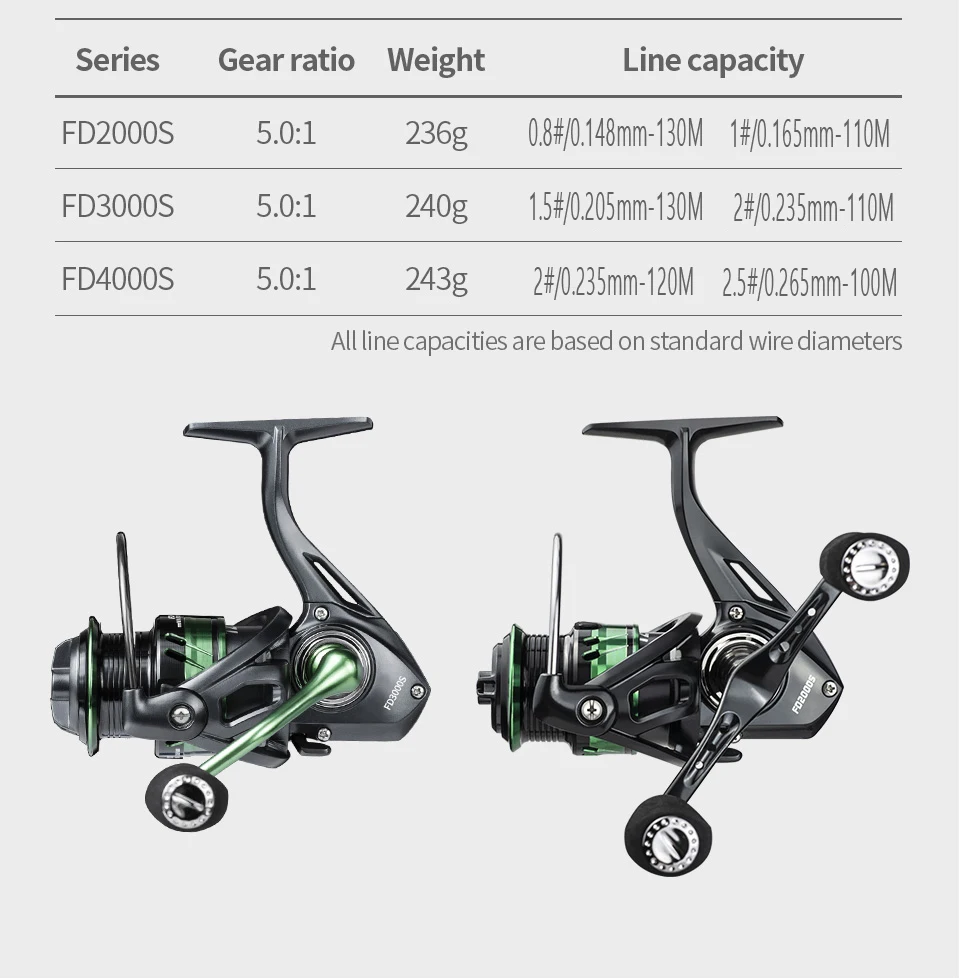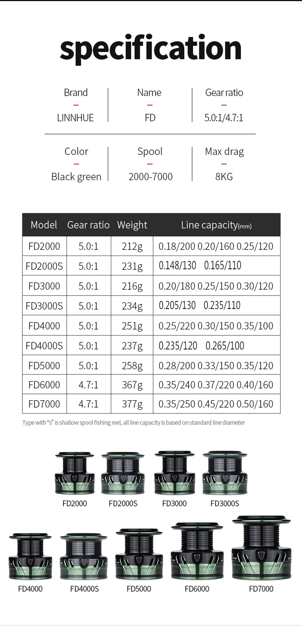 + El tipo con "S" es un carrete de pesca de carrete poco profundo, toda la capacidad de la línea se basa en el diámetro de la línea estándar