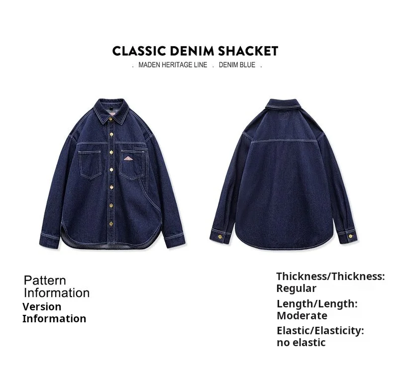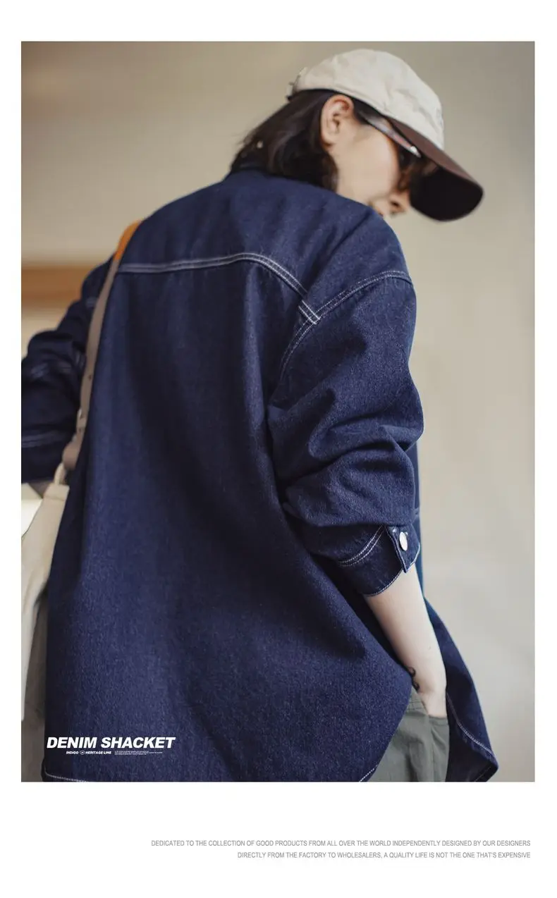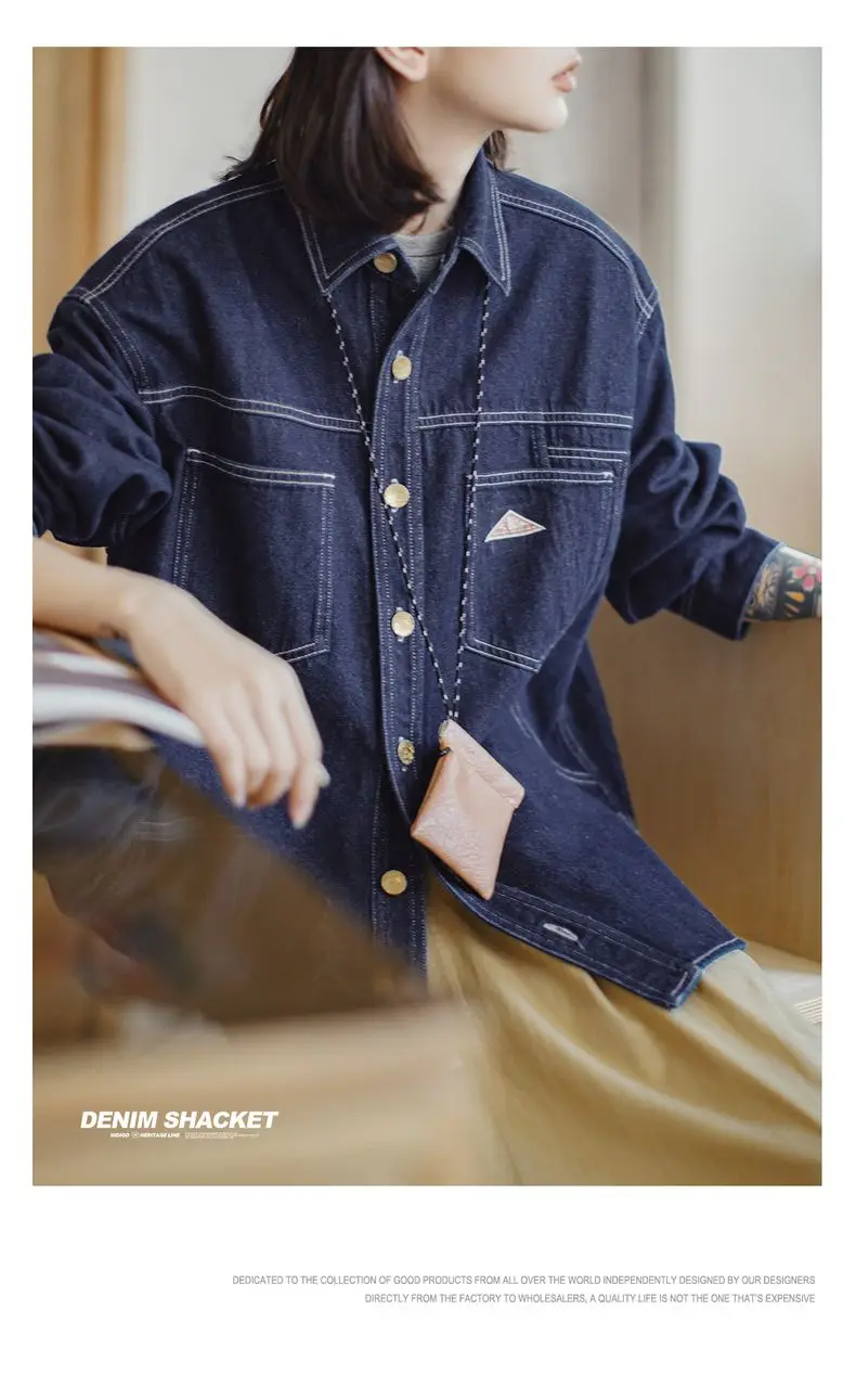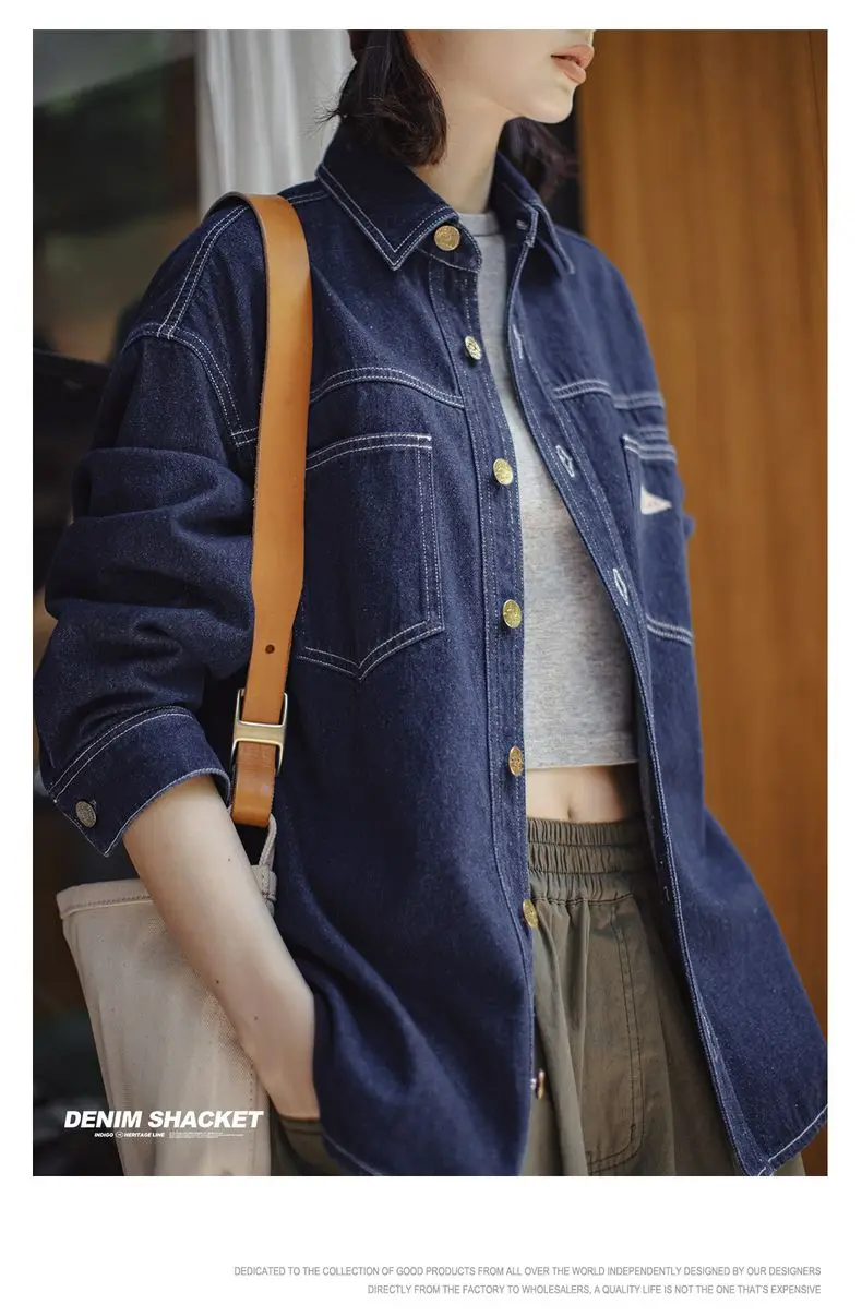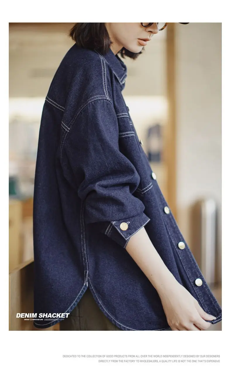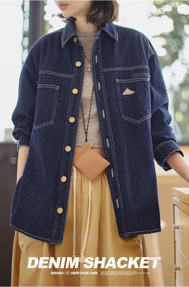 feature 1: Maden Women's Denim Long Sleeve Shirt Vintage Contrast Stitching Loose Fit Shacket for Spring and Fall Casual Single-breasted Commuter Blouse