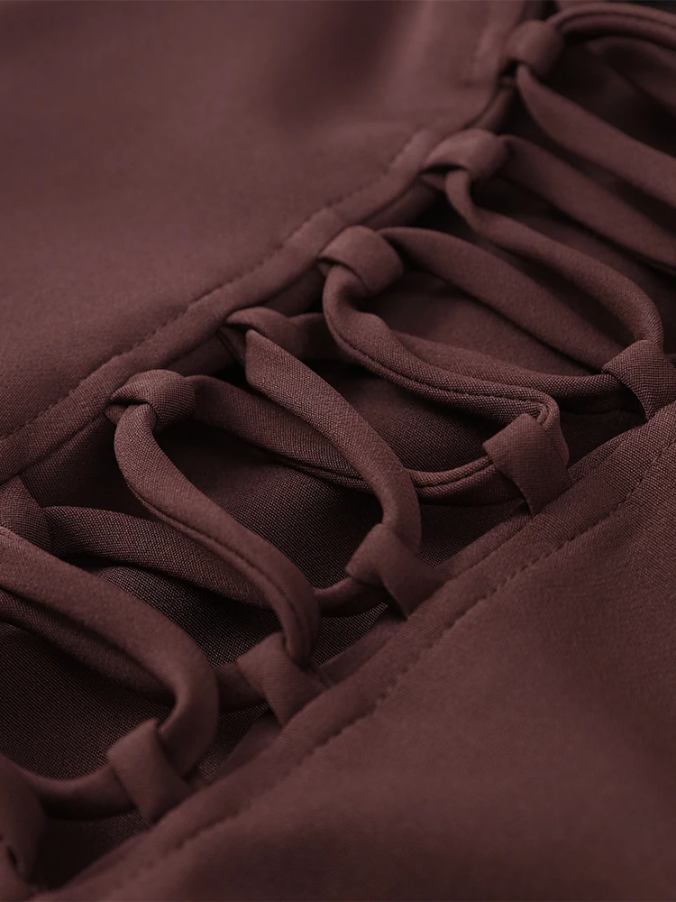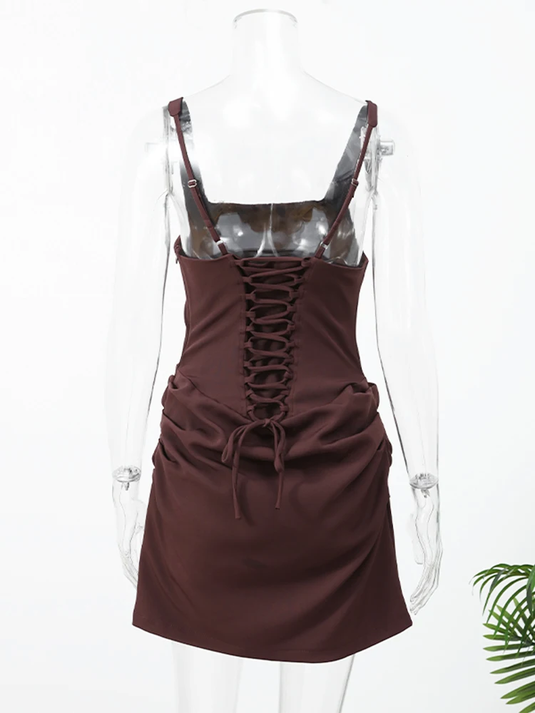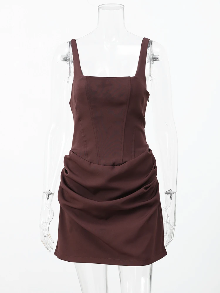 Vestido Mini Sexy Marrón con Dobladillo Plisado para Mujer, Vestido de Fiesta de Verano 2025 con Cuello en U, Sin Mangas, Espalda Descubierta y Vendaje Ajustado