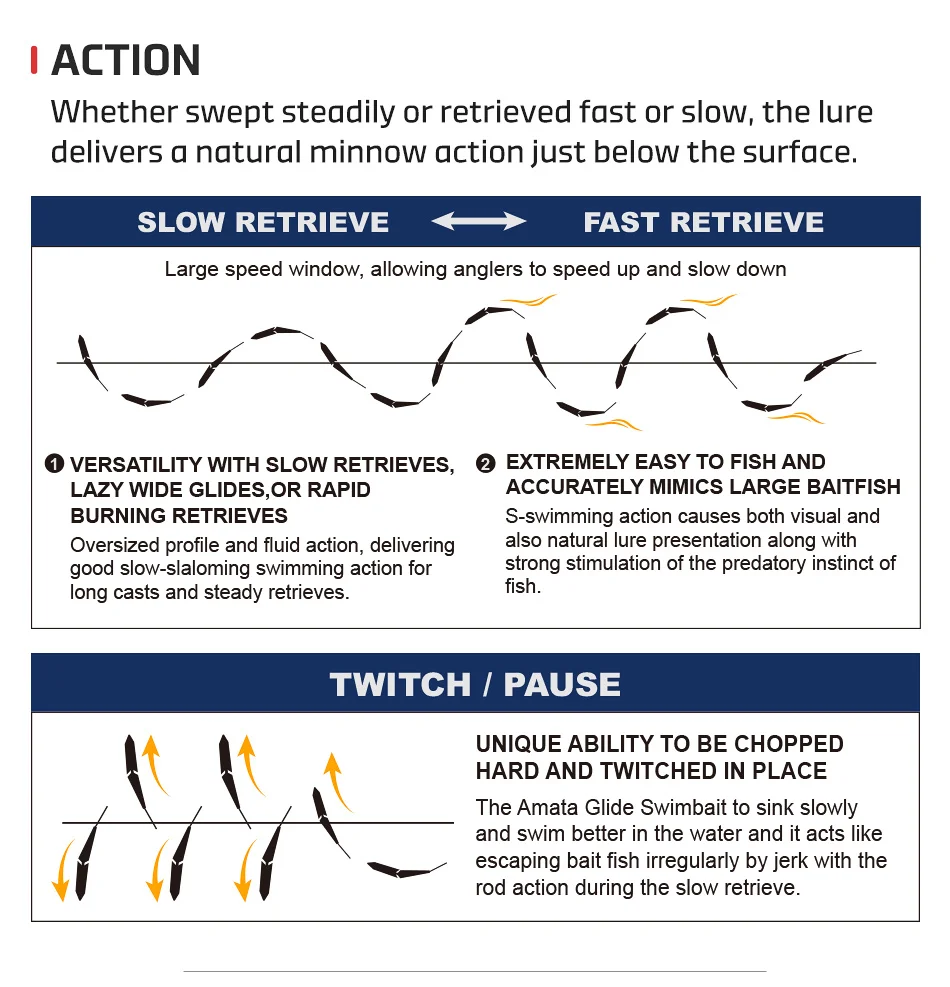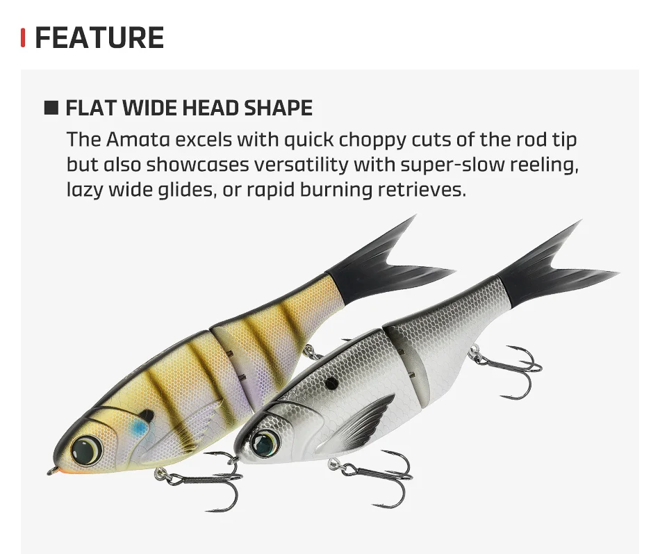 Mostrando su versatilidad, Amata Glide Swimbait es mortal con cada cadencia, desde recuperaciones súper lentas hasta quemaduras más rápidas, deslizamientos anchos y perezosos o cortes rápidos para convertirlo en un cebo verdaderamente todo.