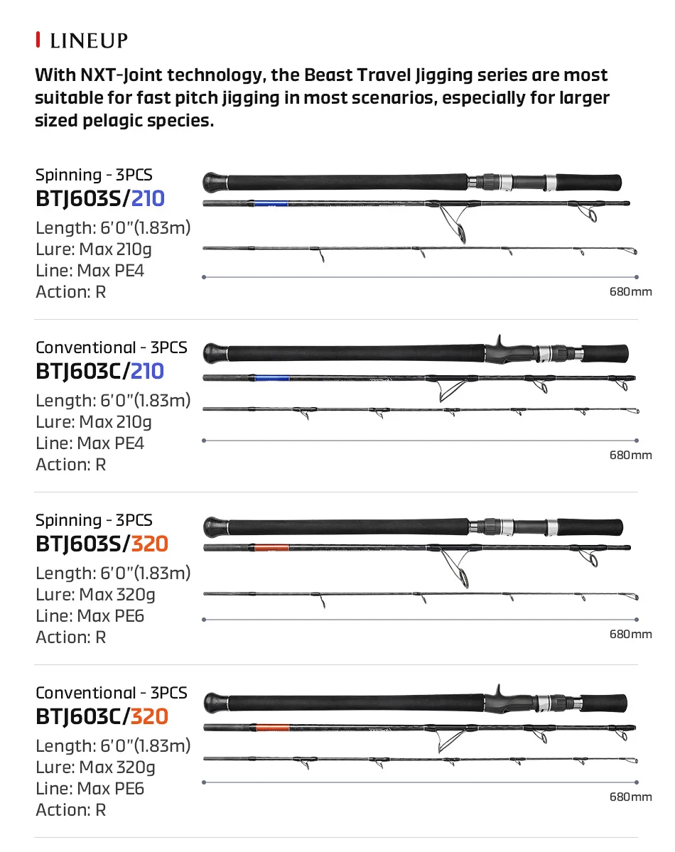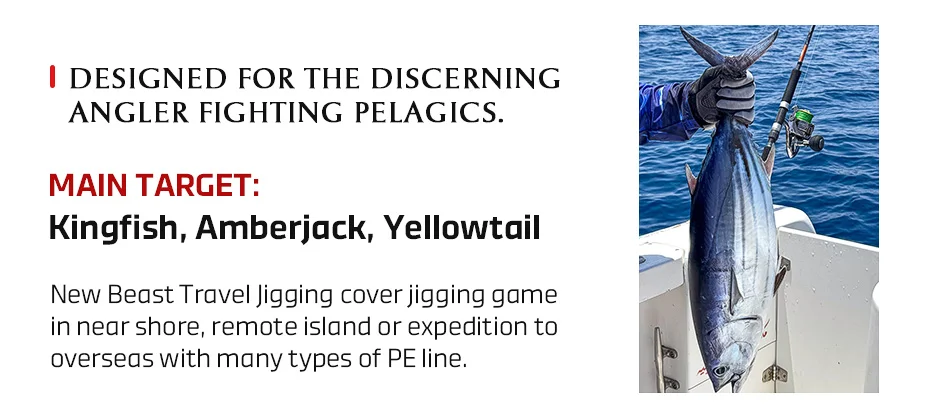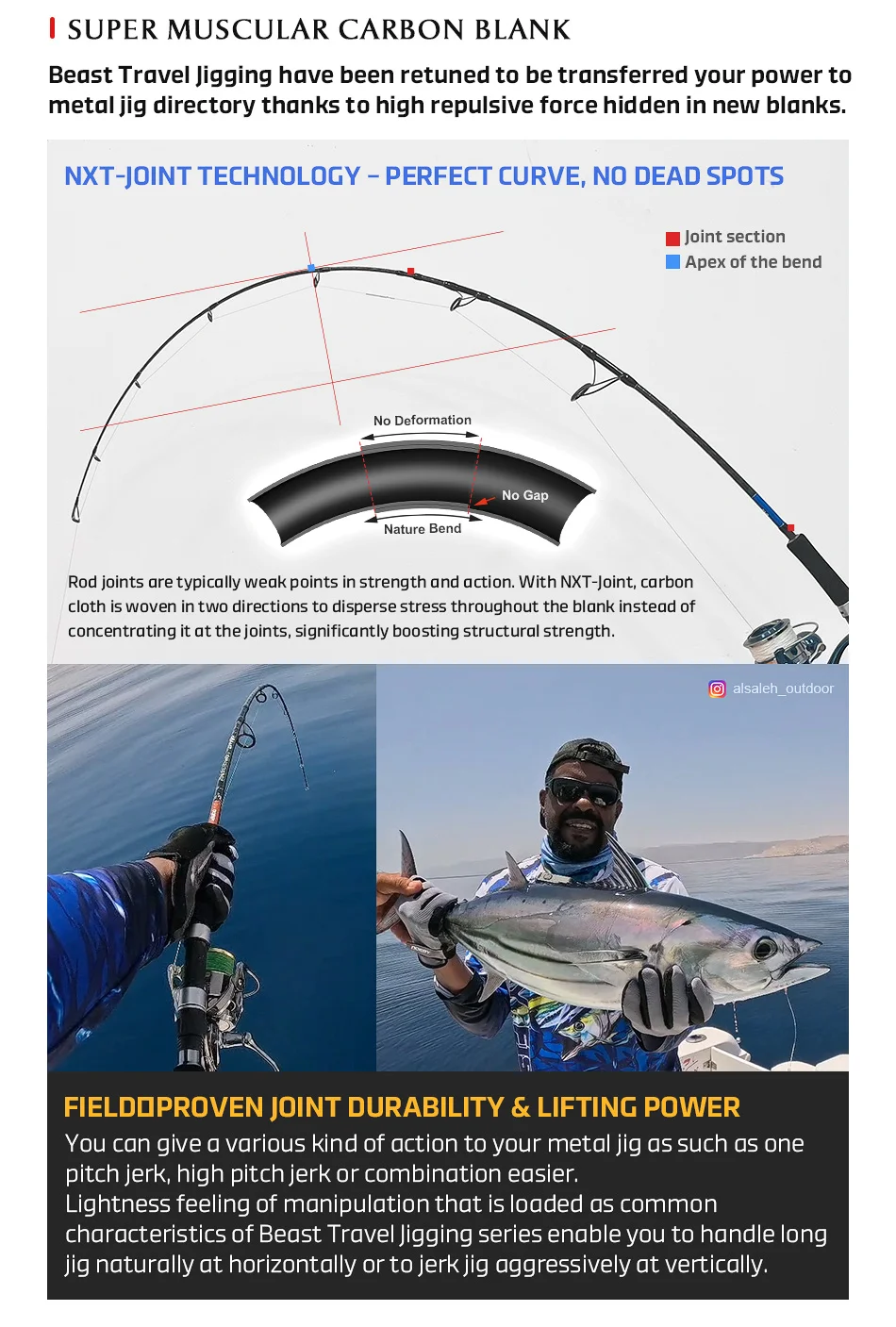 Con la tecnología NXT-Joint, la serie Beast Travel Jigging es la más adecuada para jigging de tono rápido en la mayoría de los escenarios, especialmente para especies pelágicas de mayor tamaño.