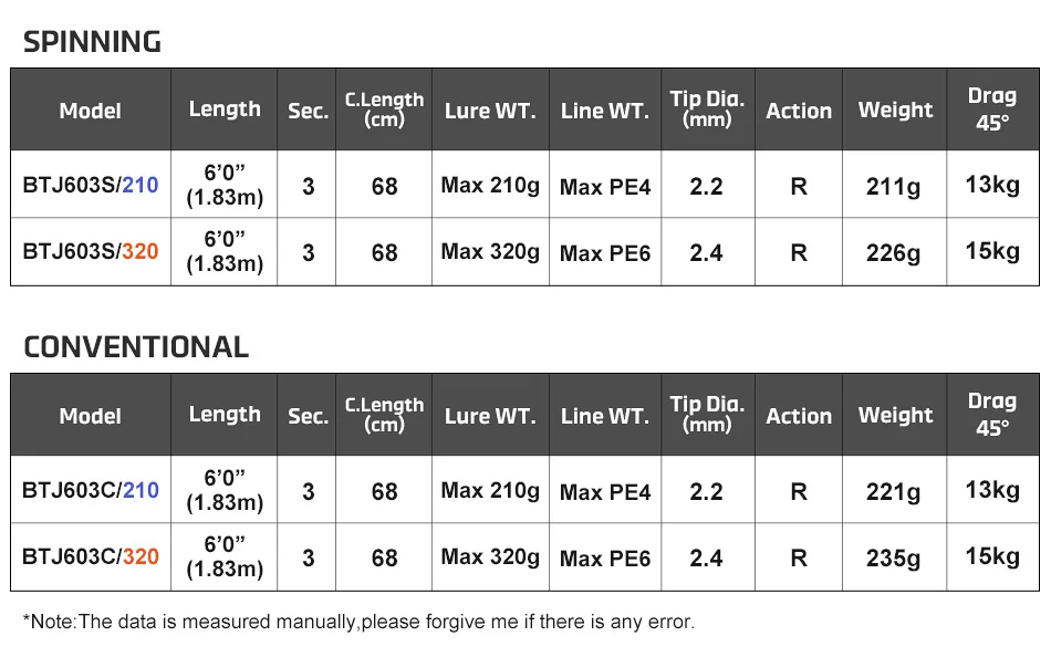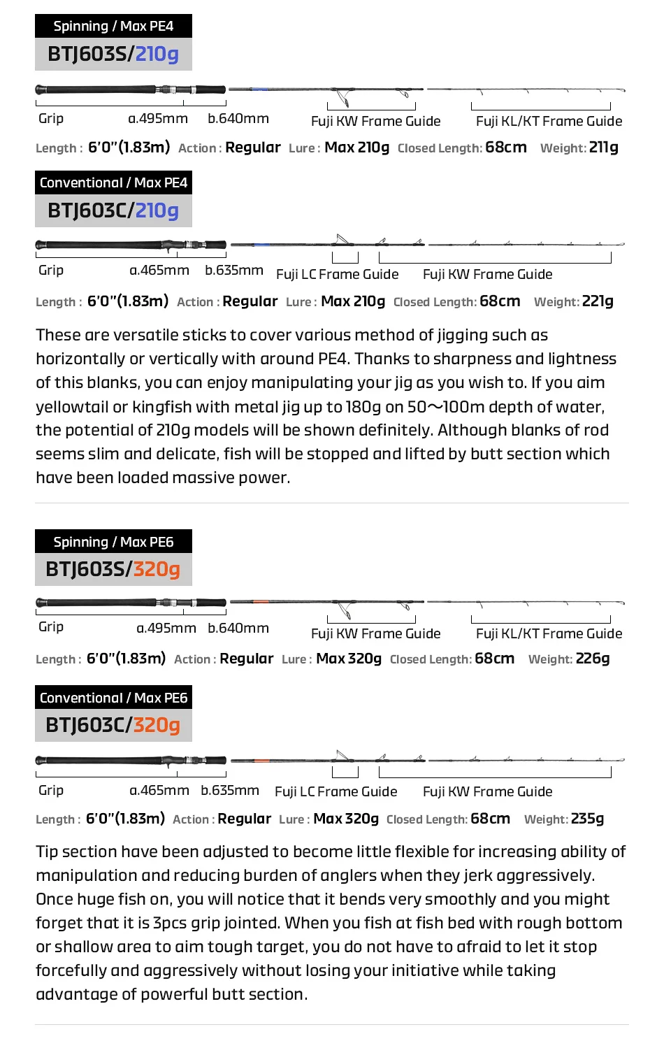 Estos son palos versátiles para cubrir varios métodos de jigging, como horizontal o verticalmente, con alrededor de PE4.Gracias a la nitidez y ligereza de estos espacios en blanco, podrás disfrutar manipulando tu plantilla como desees.Si apunta la cola amarilla o el pez rey con una plantilla de metal de hasta 180 g con una profundidad de agua de 50 ~ 100 m, definitivamente se mostrará el potencial de los modelos de 210 g.Aunque los espacios en blanco de la caña parecen delgados y delicados, los peces se detendrán y levantarán mediante una sección de culata que se ha cargado con un poder masivo.