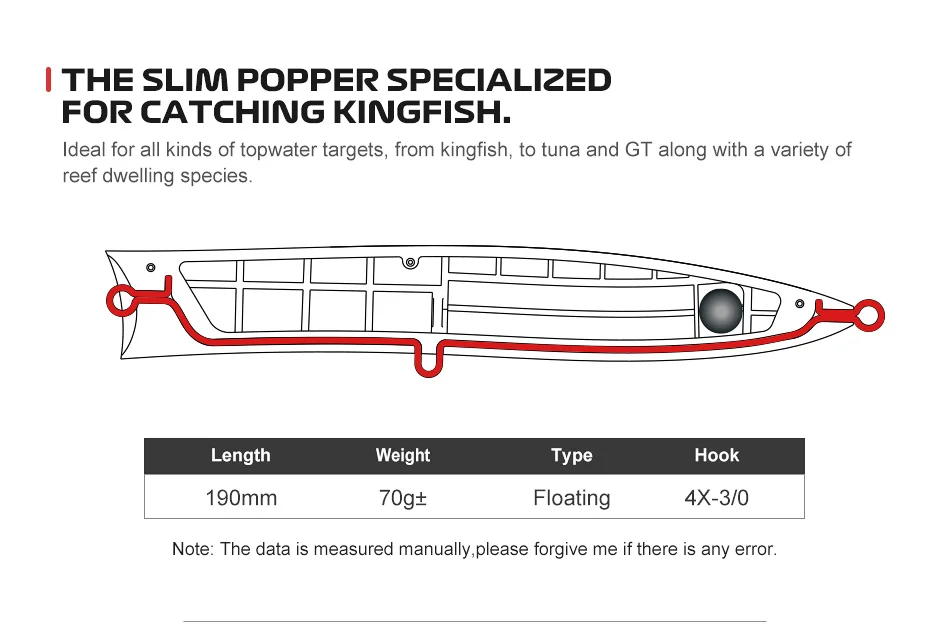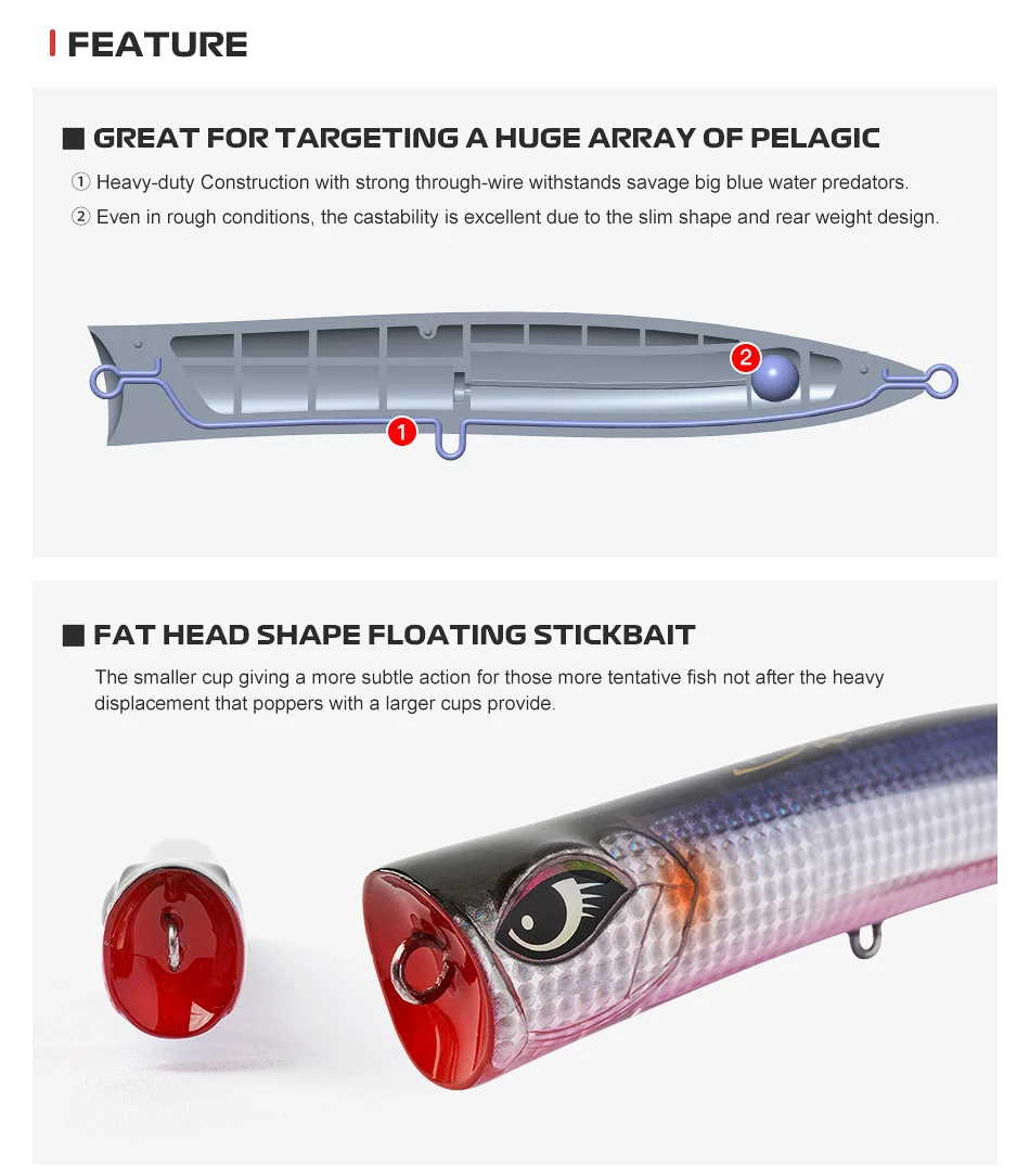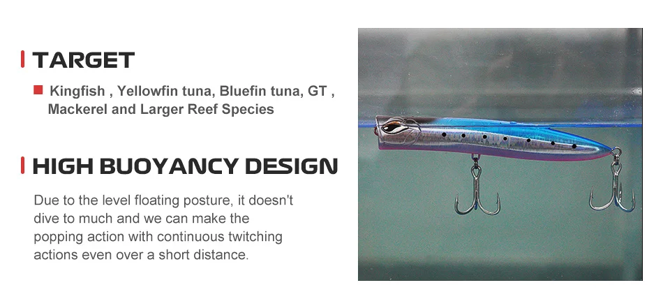 Ideal para todo tipo de objetivos superficiales, desde kingfish hasta atún y GT junto con una variedad de especies habitables de arrecife.