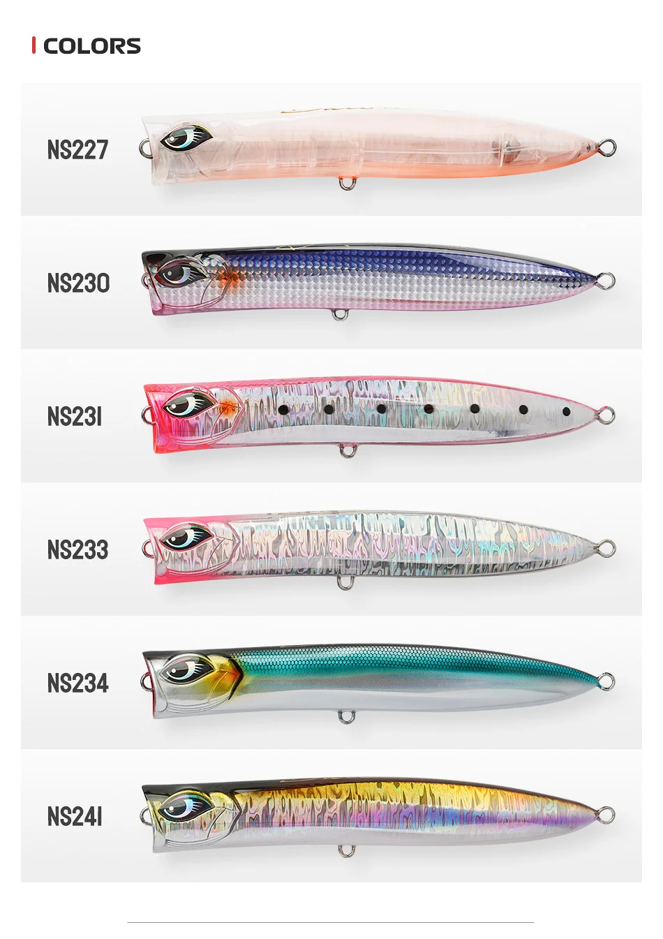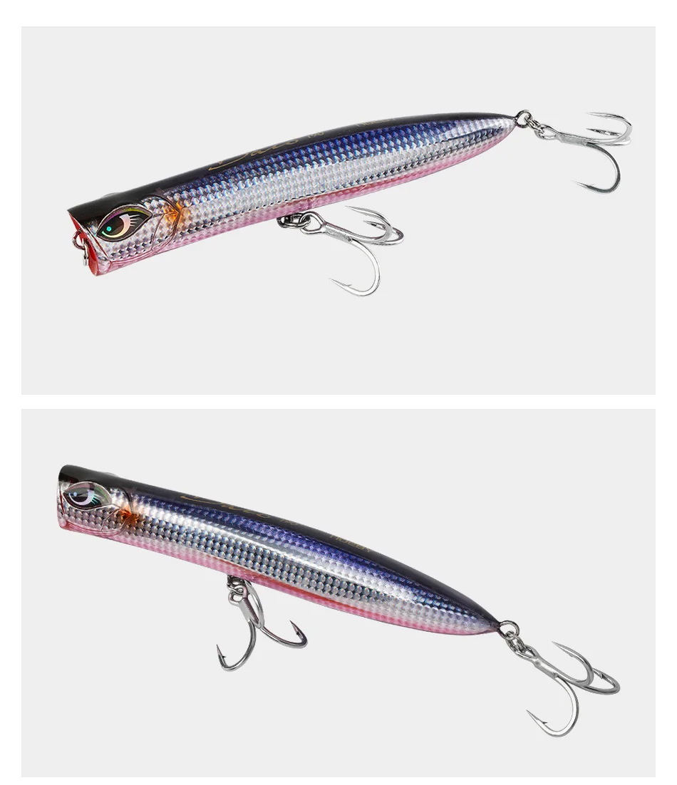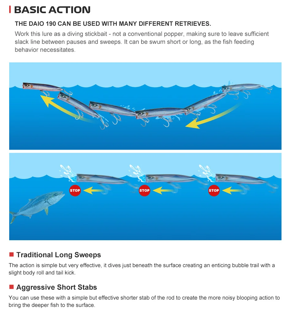 Trabaje este señuelo como un cebo para buceo, no como un popper convencional, asegurándose de dejar suficiente línea de holgura entre pausas y barrido.Puede sufrir golpes cortos o largos, según lo necesario el comportamiento de alimentación de peces.