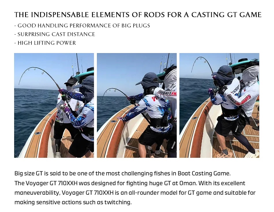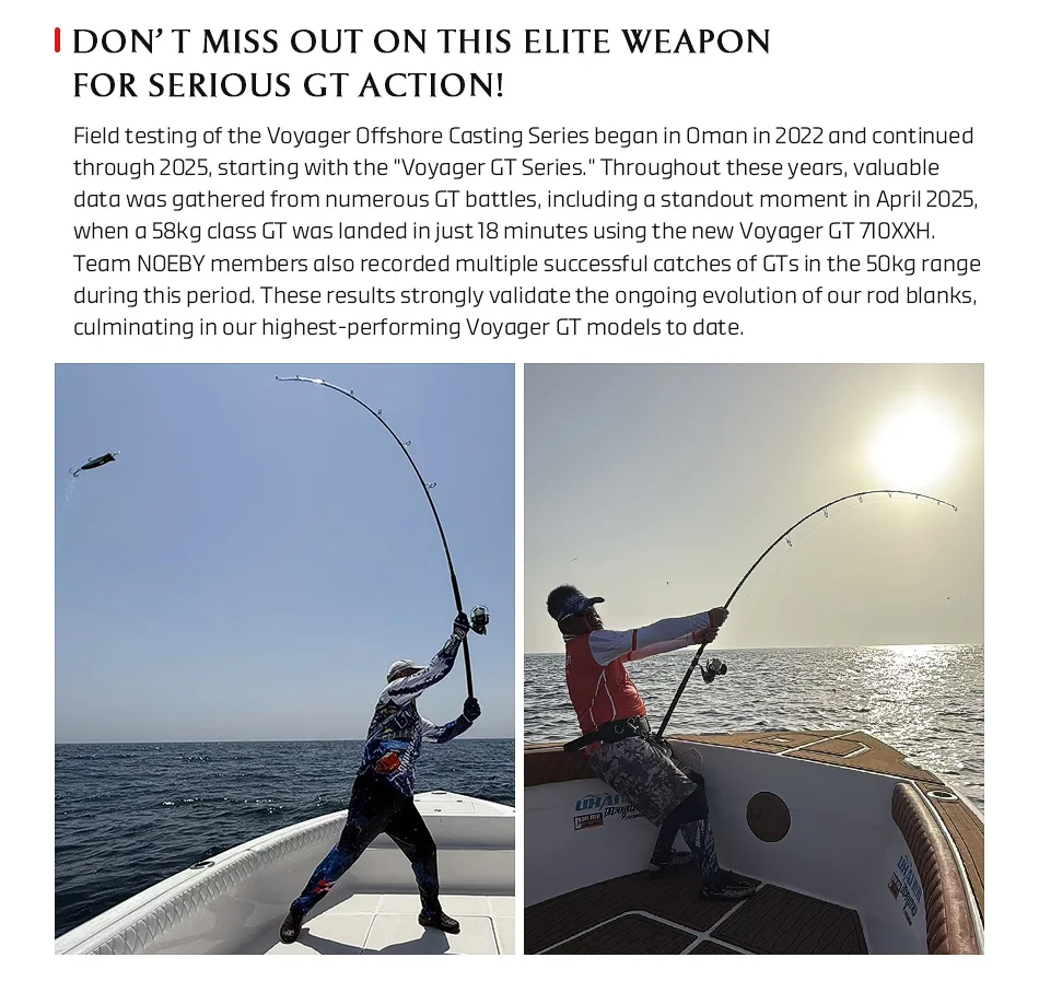 Las pruebas de campo de Voyager Offshore Casting Series comenzaron en Oman en 2022 y continuaron a través de 2025, comenzando con la "Serie Voyager GT".A lo largo de estos años, se reunió datos valiosos de numerosas batallas de GT, incluido un momento de destaque en abril de 2025, cuando se aterrizó una clase GT de 58 kg en tan solo 18 minutos utilizando el nuevo Voyager GT 710XXH.Los miembros del equipo de NOEBY también registraron múltiples capturas exitosas de GT en el rango de 50 kg durante este período.Estos resultados validan fuertemente la evolución continua de nuestros espacios en blanco de caña, culminando en nuestros modelos Voyager GT de mayor rendimiento hasta la fecha.