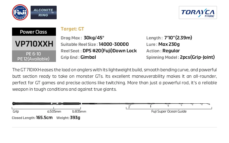 El GT 710XXH alivia la carga de los pescadores con su construcción liviana, su curva de flexión suave y su poderosa sección de glúteos lista para enfrentar los monstruosos GT.Su excelente maniobrabilidad lo convierte en un todoterreno, perfecto para juegos GT y acciones precisas como la contracción.Más que una simple caña potente, es un arma fiable en condiciones difíciles y contra verdaderos gigantes.