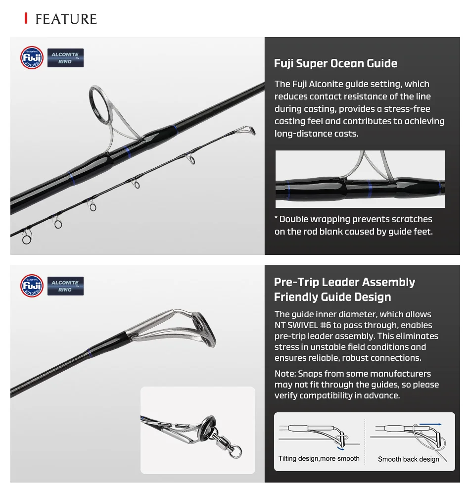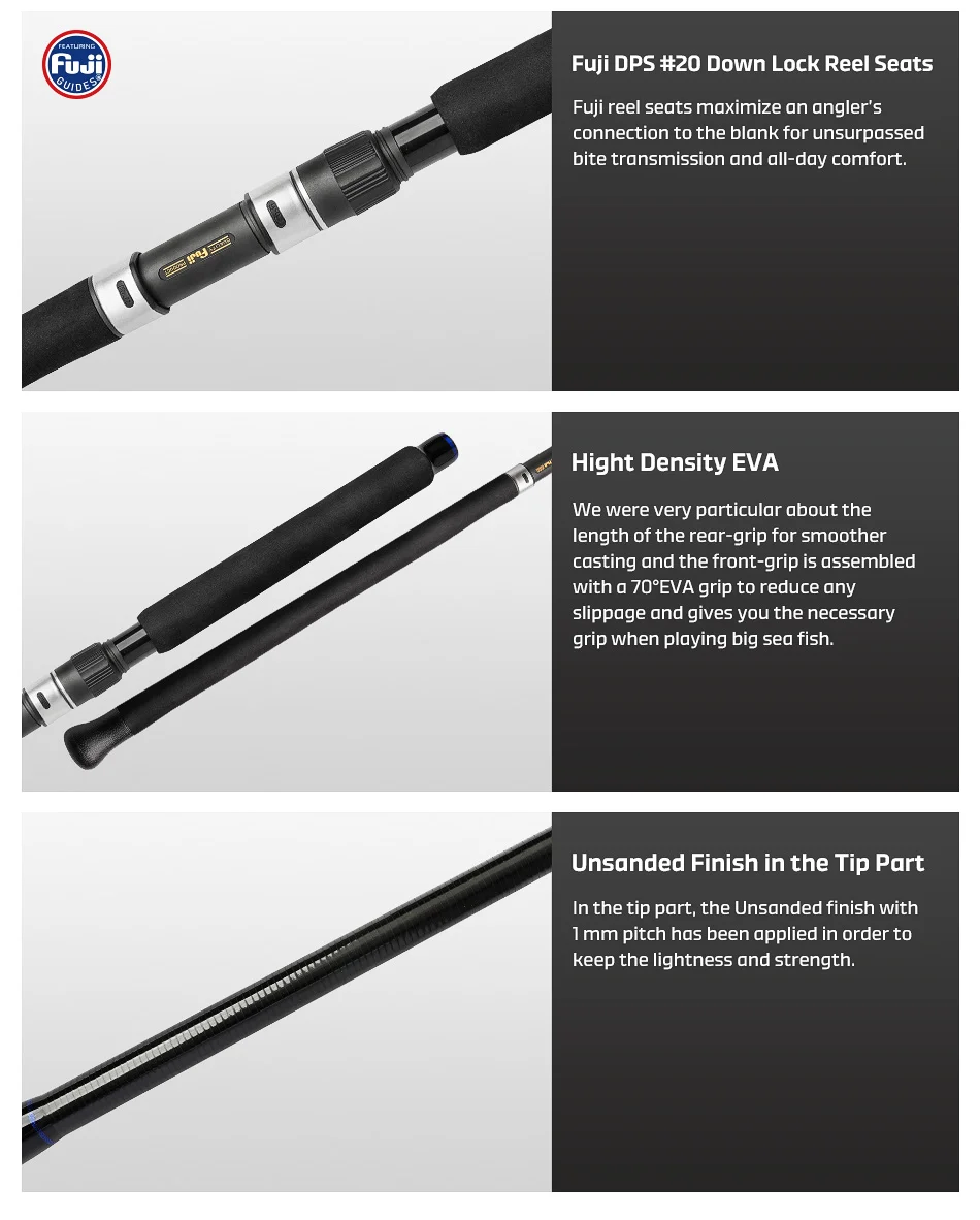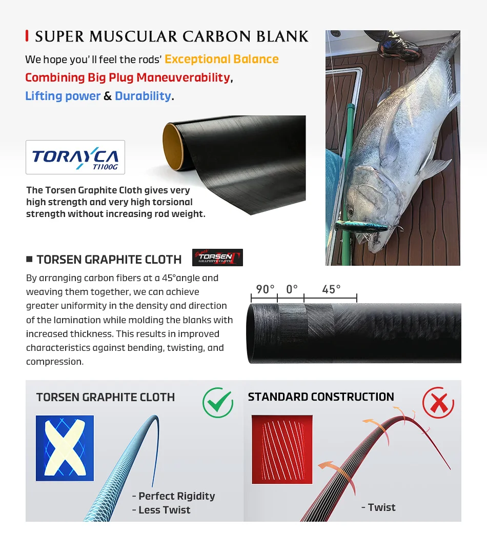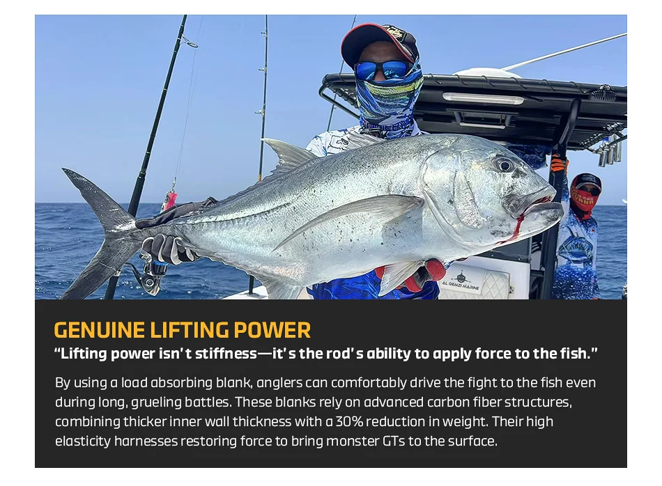 Al utilizar un espacio en blanco que absorbe la carga, los pescadores pueden provocar cómodamente la pelea hacia los peces incluso durante batallas largas y agotadoras.Estos espacios en blanco dependen de estructuras avanzadas de fibra de carbono, combinando un espesor de pared interior más grueso con una reducción del 30 % de peso.Su alta elasticidad aprovecha la fuerza recuperadora para aportar monstruos GTs a la superficie.