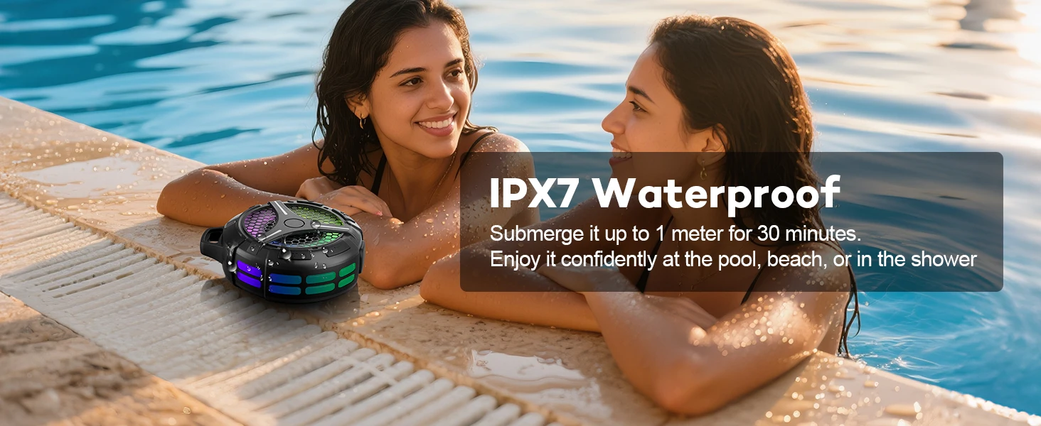 Este altavoz de ducha, reforzado con protección de nivel IPX7, ofrece una sólida resistencia al agua, el vapor, el polvo y los golpes, lo que lo convierte en una opción ideal para baños, relajación junto a la piscina y aventuras al aire libre.Además, el altavoz incluye una ventosa segura para mayor estabilidad, lo que le permite adherirse firmemente al vidrio, la cerámica o cualquier superficie lisa.