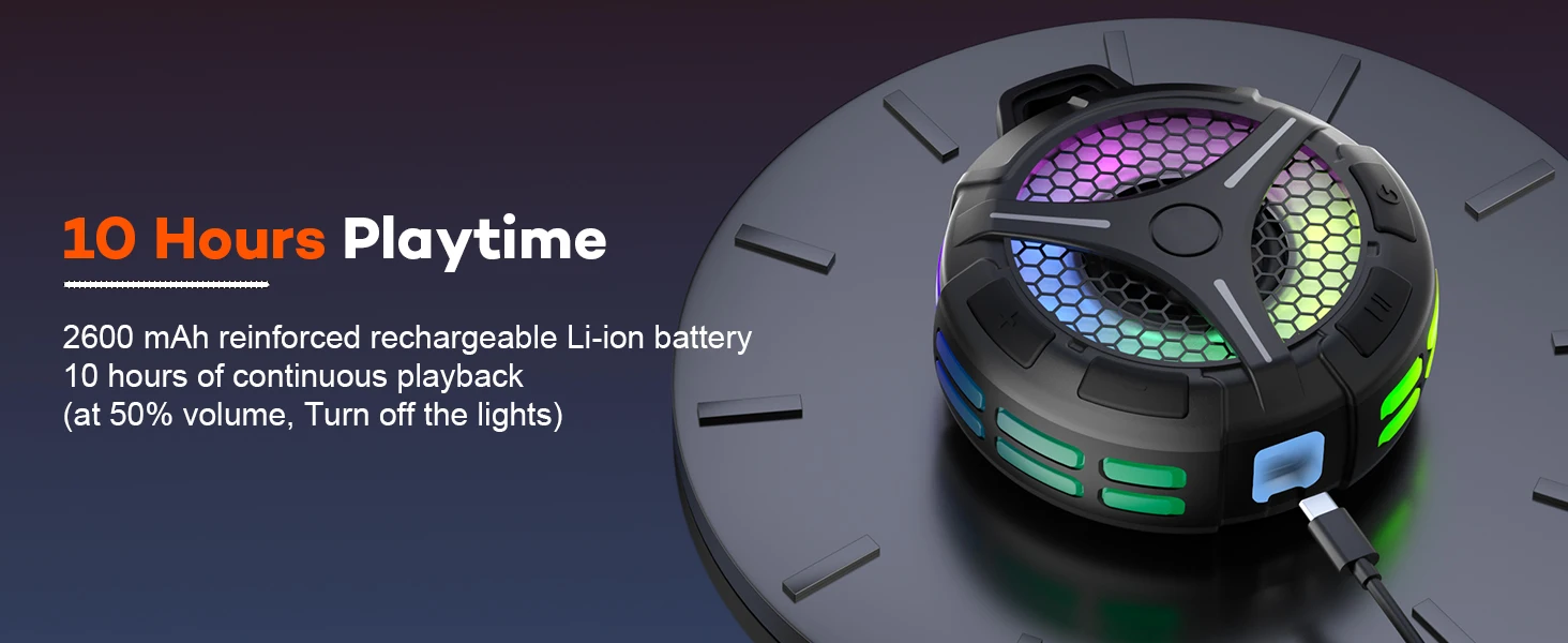 Este altavoz portátil bluetooth de 70*50*40mm, con una batería de 2600mAh para hasta 10 horas de reproducción, es ideal para uso en el baño y otros ambientes húmedos.Disfruta de música ininterrumpida en la ducha o en casa sin preocuparte por recargarla.¡Elegante, portátil y perfectamente adecuado para cualquier habitación o aventura! (Nota: presione brevemente el botón hacia adelante/atrás para cambiar de canción, presione prolongadamente para ajustar el volumen).