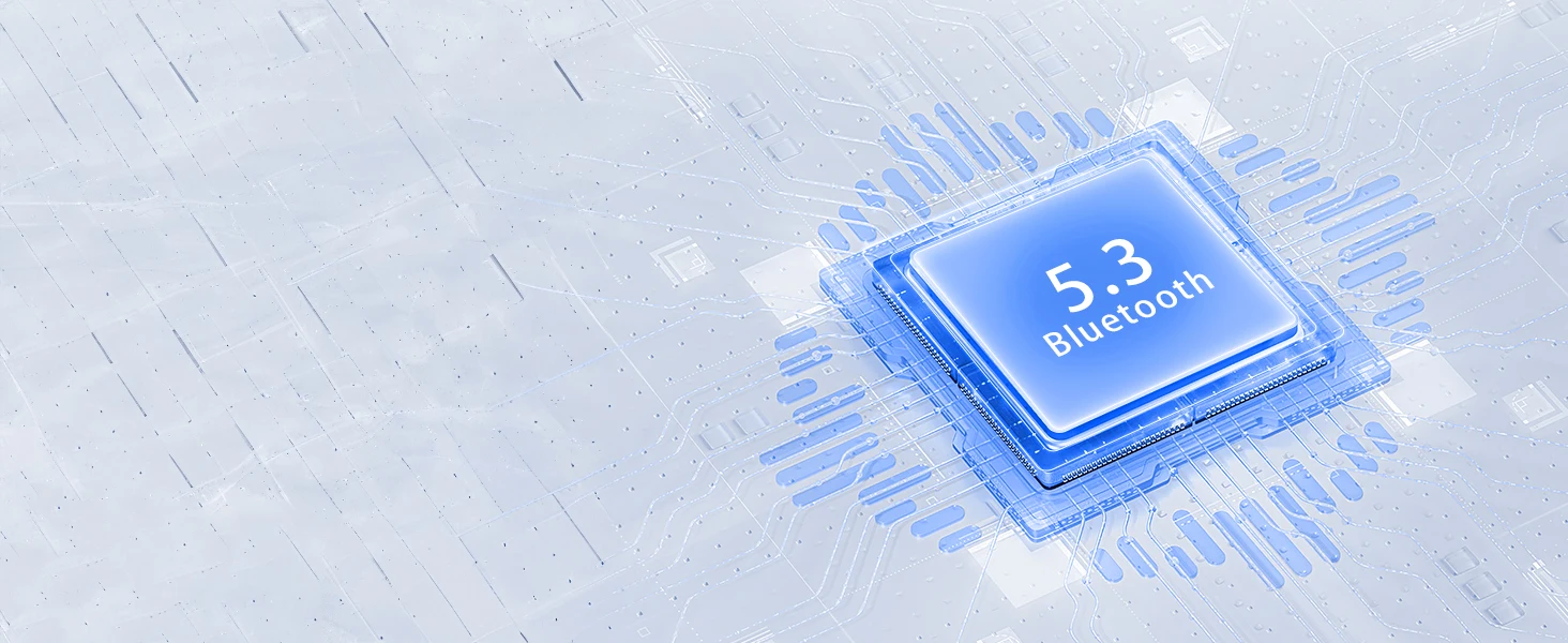 Equipado con la última tecnología Bluetooth 5.3, le permite conectarse rápida y fácilmente de forma inalámbrica a varios dispositivos como teléfonos inteligentes, tabletas y computadoras portátiles, y continúa brindándole una excelente calidad de transmisión de audio.Puedes reproducir tu música favorita como desees, eliminando la molestia de conectar cables tradicionales a los dispositivos y disfrutando de la mejor experiencia musical.