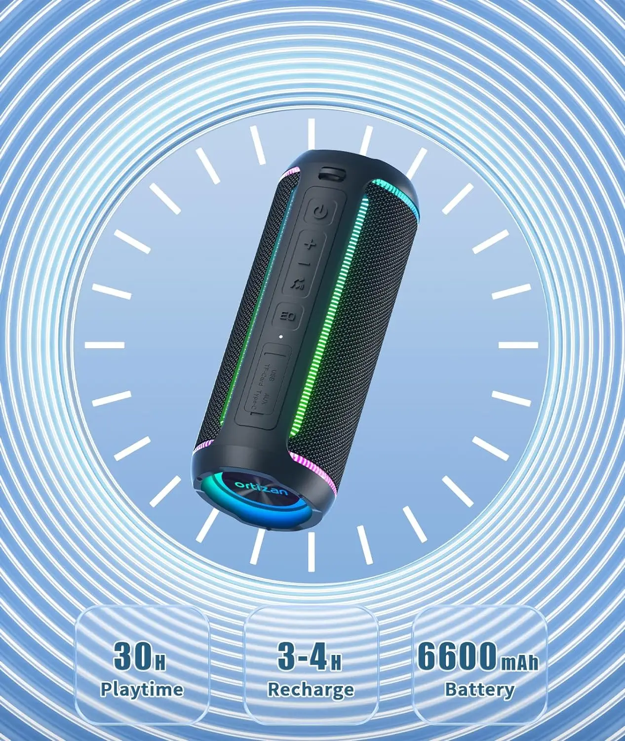 X30 presenta un estilo atrevido y un rico sonido original de Ortizan.Su llamativo diseño vanguardista, sus coloridas luces para correr y sus detalles expresivos lo convierten en un accesorio imprescindible para su próxima noche de salida.¡Ortizan X30 mantiene tu música bombeando!Colocado vertical u horizontalmente, parece tan vívido como suena.