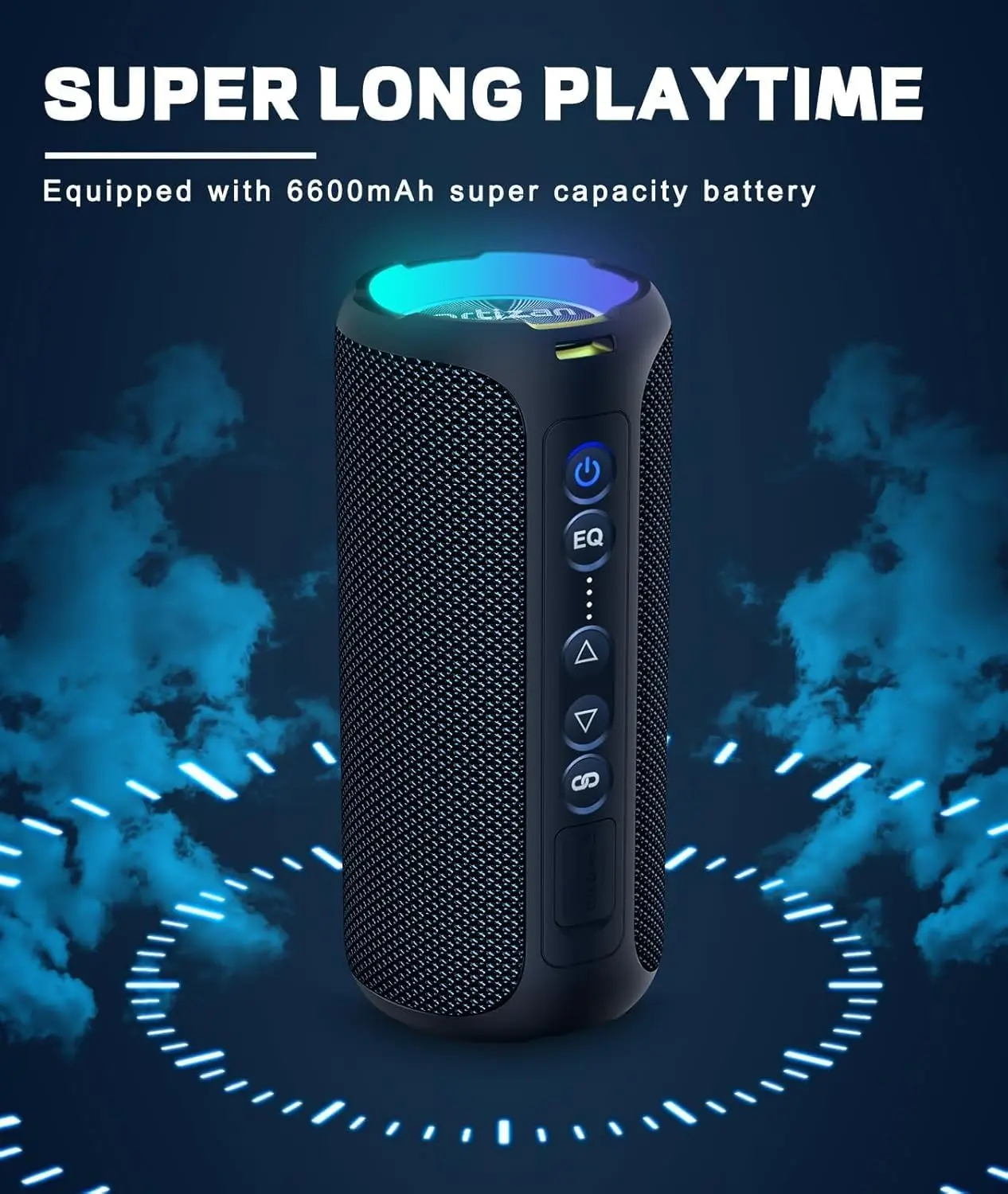 Batería incorporada de alta potencia 5C de 6600 mAh, que se puede cargar más de 1200 veces.En comparación con la batería recargable 300 de los parlantes normales, ¡la vida útil es de hasta 4 veces!Proporciona una potencia más fuerte y duradera al tiempo que garantiza una experiencia auditiva inmersiva en viajes largos al aire libre.La luz indicadora de encendido está especialmente diseñada en el botón, lo que le permite comprender fácilmente el uso de energía del altavoz.