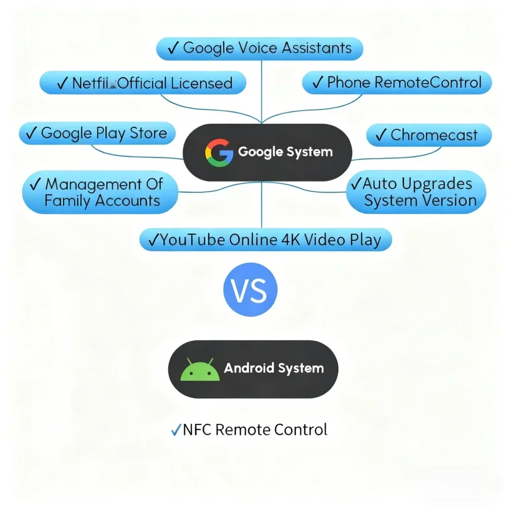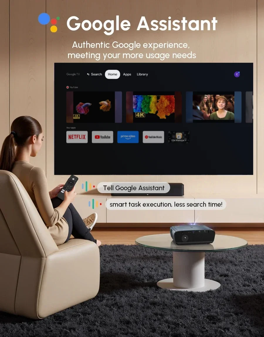 ?: Google TV + Google Play, ecosistema oficial, aplicaciones masivas, reproducción en HD, inteligente y fácil de usar, uso compartido entre múltiples pantallas. Convierte tu proyector en una pantalla grande inteligente al instante.