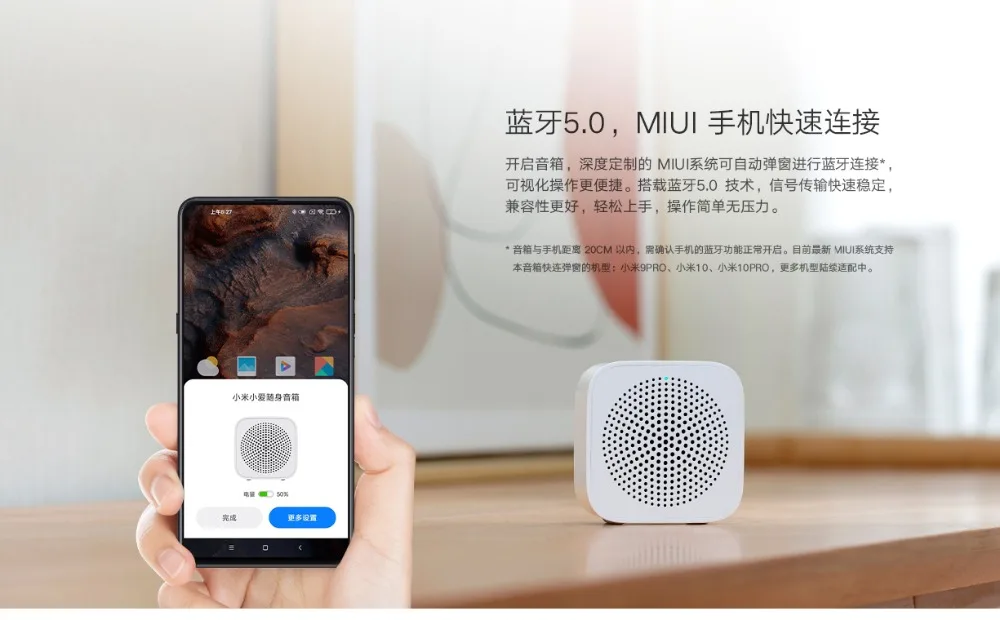 Bluetooth 5.0, conexión rápida de teléfono móvil MIUIEncienda el altavoz, el sistema MIUI profundamente personalizado puede abrir automáticamente la ventana para conexión Bluetooth*,La operación visual es más conveniente.Equipado con tecnología Bluetooth 5.0, la transmisión de la señal es rápida y estable,Mejor compatibilidad, fácil de usar, funcionamiento sencillo sin presión.*La distancia entre el altavoz y el teléfono móvil es de 20 cm.Confirme que la función Bluetooth del teléfono móvil esté activada normalmente.El último soporte del sistema MIUILos modelos con ventanas emergentes rápidas de este altavoz: Xiaomi 9PRO, Xiaomi 10, Xiaomi 10PRO, se adaptan más modelos.